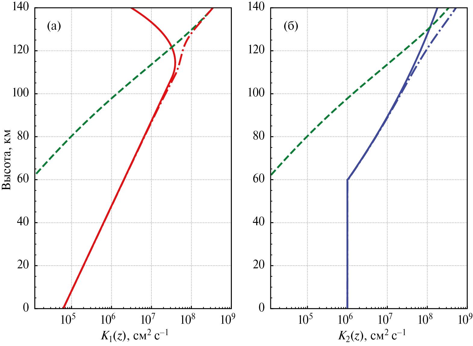 Рис. 3. На графиках сплошной линией изображены коэффициенты турбулентной диффузии, вычисленные по формуле (4) для (а) и по формуле (6) для (б). Пунктирной линией изображены вычисленные ранее коэффициенты молекулярной диффузии для компоненты O. Штрихпунктирной линией обозначен суммарный коэффициент диффузии D0 = D + K.