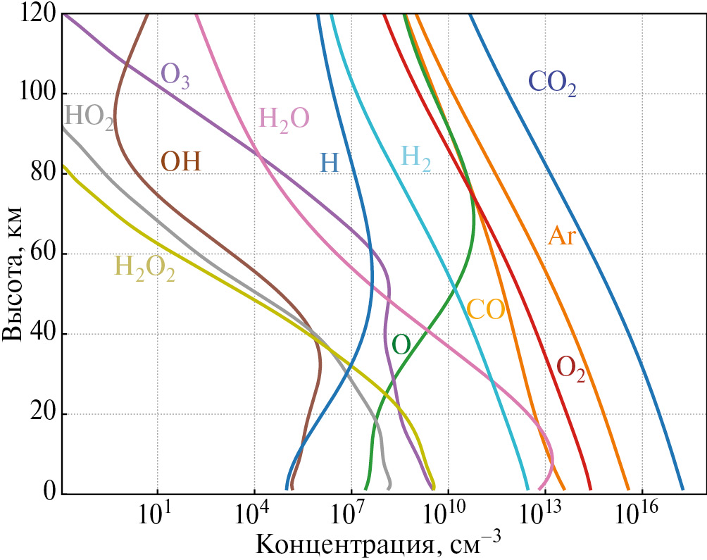 Рис. 4. Полученный по результатам расчетов по первому методу высотный среднесуточный профиль концентраций химических компонент атмосферы Марса для средних широт и условия равноденствия.