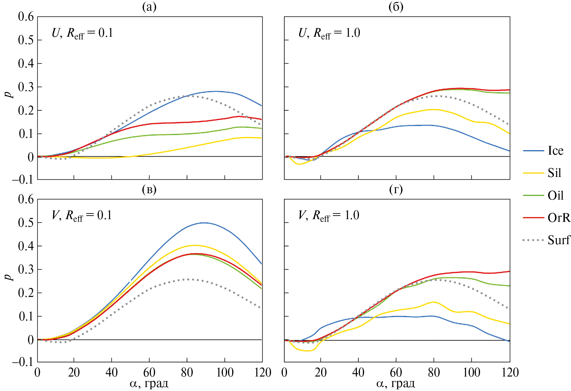 Рис. 2. Степень линейной поляризации света P, отраженного модельным астероидом с экзосферой на длинах волн 0.36 и 0.54 мкм (каналы U и V соответственно), в зависимости от фазового угла наблюдений α. Частицы в экзосфере – смеси случайно ориентированных сфероидов при Reff = 0.1 и 1.0 мкм, νeff = 0.05 и E = 0.7–1.3: (а) – λ = 0.36 мкм, Reff = 0.1 мкм; (б) – λ = 0.36 мкм, Reff = 1.0 мкм; (в) – λ = 0.54 мкм, Reff = 0.1 мкм; (г) – λ = 0.54 мкм, Reff = 1.0 мкм. Показаны модели для частиц льда H2O (“Ice”), астрономических силикатов (“Sil”), оливина (“Oli”) и тугоплавкой органики (“OrR”), а также модель для астероида без экзосферы (“Surf”). Оптическая толщина экзосферы принята равной τ = 0.5 на λ = 0.54 мкм.