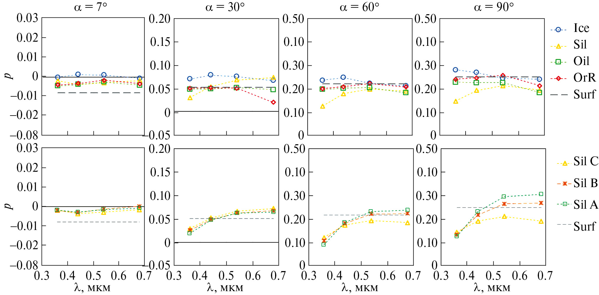 Поскольку анализ спектров отдельных АА в период их активности, вероятно обусловленной сублимацией летучих с их поверхности у перигелия, привел к выводу о присутствии в их экзосферах агрегатных частиц, содержащих гранулы радиусом около 0.1 мкм (Busarev и др., 2021; Бусарев и др., 2023; Петрова, Бусарев, 2023), мы считаем возможным ограничить наше дальнейшее рассмотрение поляризационных характеристик модельного АА таким размером гранул в агрегатных частицах экзосферы. Чтобы учесть отклонения гранул от этого размера в реальных частицах, мы провели усреднение характеристик агрегатных частиц, содержащих мономеры c радиусом 0.08, 0.10 и 0.12 мкм в пропорции 0.3 : 0.4 : 0.3. Спектральные зависимости значений степени линейной поляризации света, отраженного АА с экзосферой, содержащей такие частицы, приведены на рис. 6 для разных углов фазы и разного состава частиц (верхний ряд диаграмм) и их структуры (нижний ряд диаграмм). Как видно из диаграмм для α = 7°, рассеяние на агрегатных частицах указанных свойств, присутствующих в экзосфере, ослабляет отрицательную ветвь поляризации подстилающей поверхности на всех длинах волн. В то же время поляризация в положительной ветви (α20°) может становиться как меньше, так и больше, в зависимости от длины волны света, состава частиц, а также их пористости. Рассеяние на ледяных агрегатных частицах в экзосфере может изменить нейтральный спектральный градиент положительной поляризации на слабо отрицательный, а рассеяние на агрегатных частицах астрономических силикатов вносит существенный положительный градиент в поляризацию на фазовых углах α ≥ 30°. Особенно это касается пористых структур (тип А).