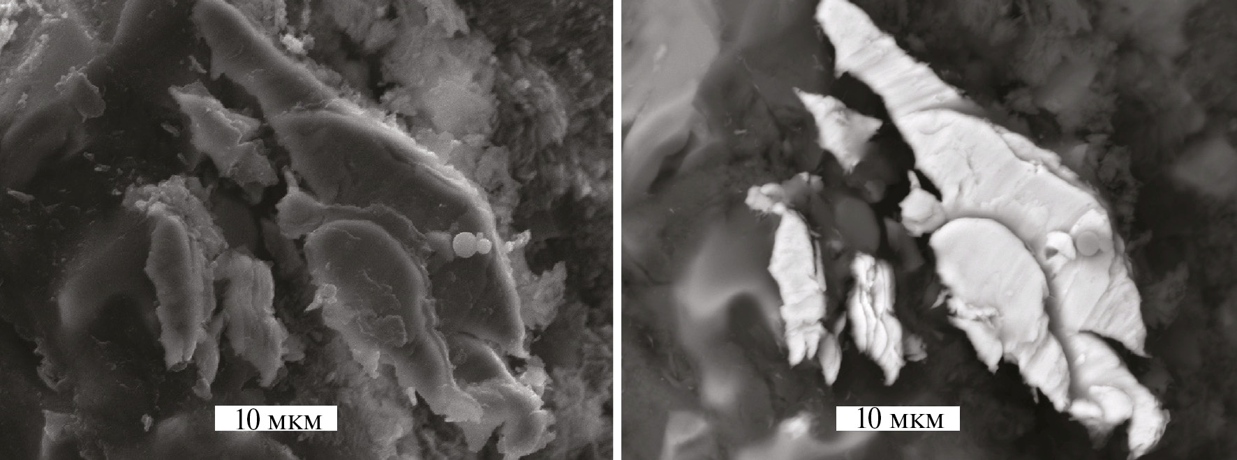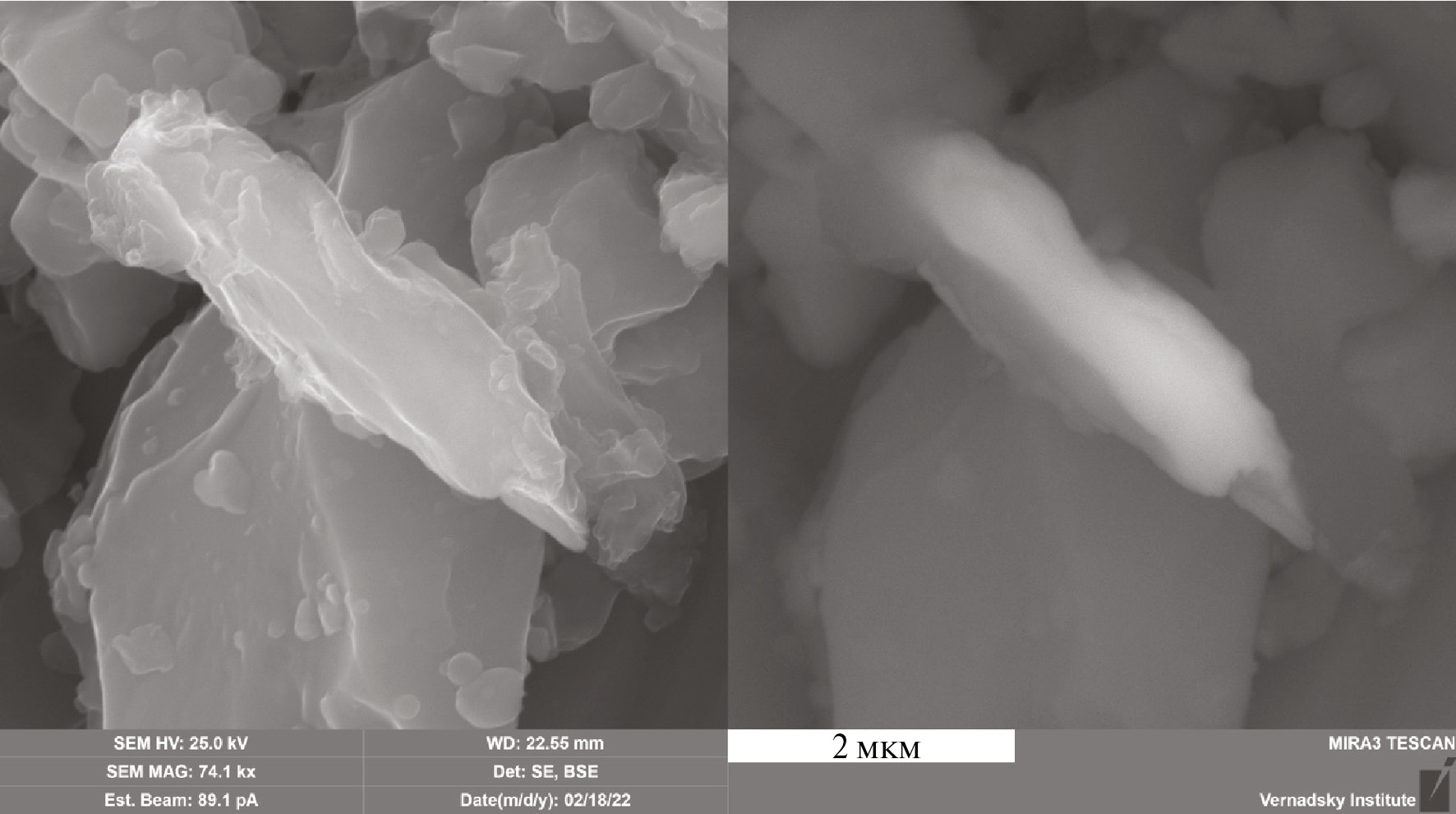 Рис. 7. Агрегат листовидных частиц Ni2Cu в матрице стекла лунного реголита. Луна-24. СЭМ. Слева – вторичные электроны. Справа – отраженные электроны.