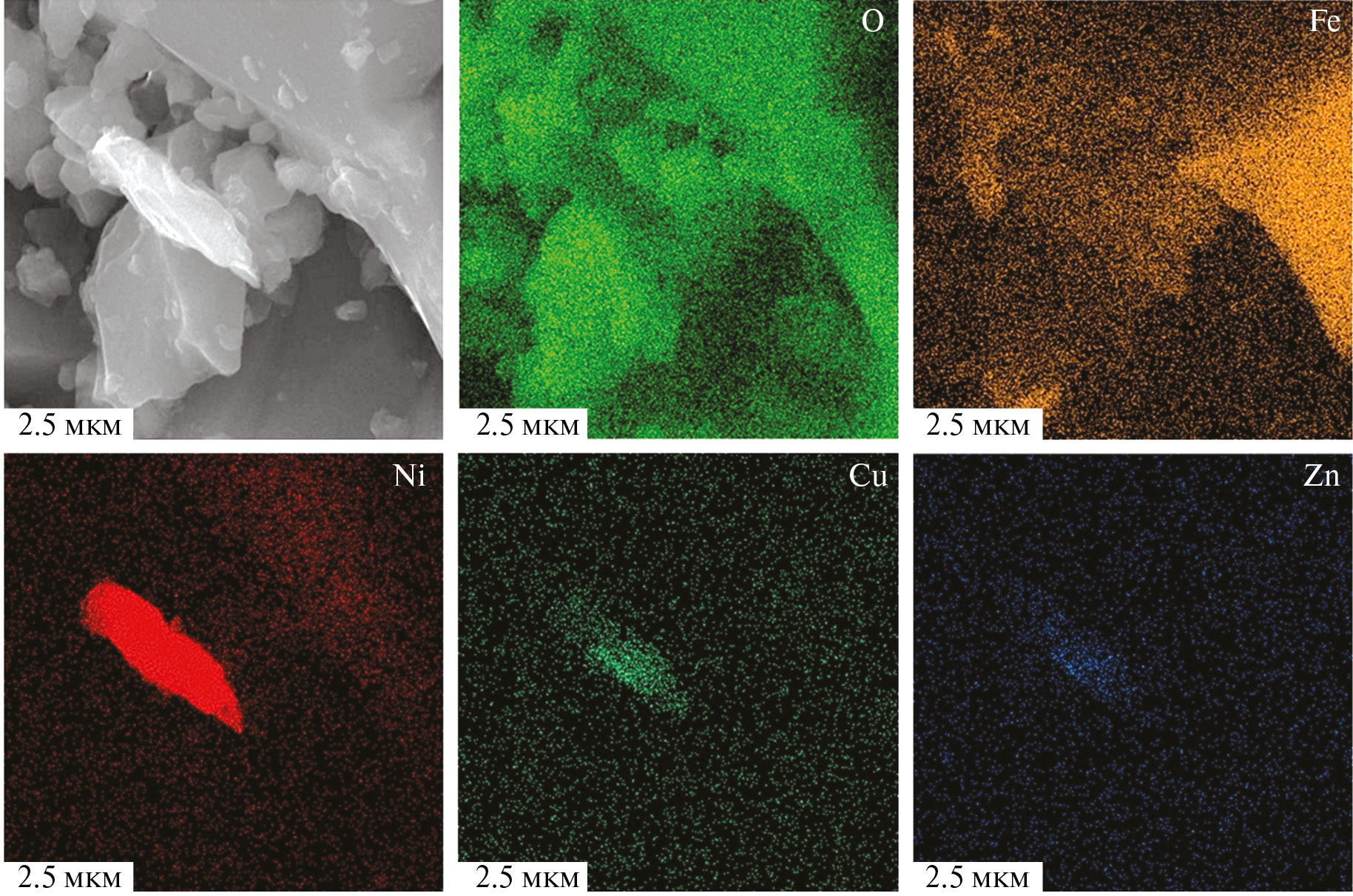 В энергодисперсионном рентгеновском спектре, полученном от этой частицы, зафиксированы пики Ni высокой интенсивности и менее интенсивные пики Cu и Zn, и кроме того, пики слабой интенсивности O, Al, Si, Ca и Fe. Чтобы определить состав обнаруженной частицы было проведено ЭДС-картирование, которое показало приуроченность Ni, а также Cu и Zn к анализируемой частице (рис. 2). Отсутствие кислорода свидетельствует о металлической форме обнаруженной частицы никеля. Кроме того, в этом металле полностью отсутствует железо. O, Al, Si, Ca и Fe принадлежат окружающей стеклянной матрице и, видимо, были флуоресцентно возбуждены при ЭДС-анализе от покрывающей ее стеклянной пленки.