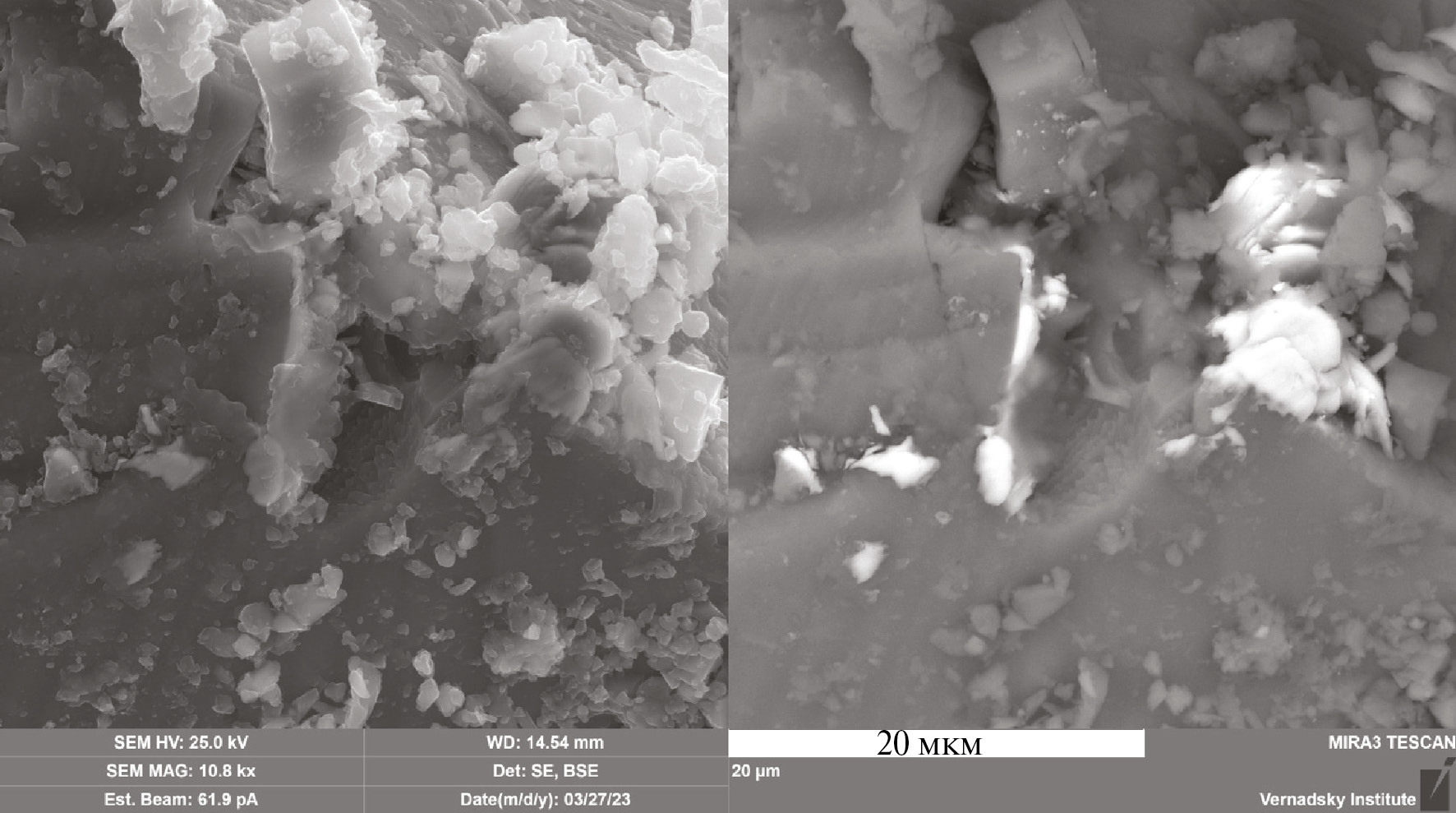 В ходе исследований были использованы сканирующие электронные микроскопы (СЭМ) JEOLJSM-5610 и Tesla MIRA-3, оснащенные рентгеновскими энергодисперсионными спектрометрами (ЭДС) Oxford Aztec. Высоколокальные методы аналитической электронной микроскопии включали в себя получение картин во вторичных (SE) и отраженных (BSE) электронах, точечных элементных анализов и карт распределения элементов по заданной площади.