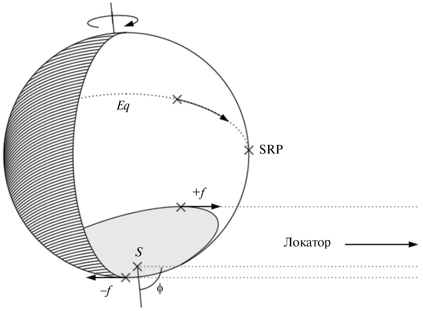 Наземные бистатические радиолокационные наблюдения Луны осуществляются путем сопровождения передающей и приемной антенными системам и выбранной цели на поверхности Луны по заранее вычисленным эфемеридам, в течение заданного интервала времени (Маршалов и др., 2018). При этом передающая антенная система освещает радиосигналом область, соответствующую пересечению главного лепестка своей диаграммы направленности с поверхностью, а приемная антенная система собирает мощность, отраженную от области, соответствующей ее диаграмме. Ближайшая к приемнику точка на поверхности Луны называется подрадарной (SRP – Sub-Radar Point). Во время наблюдений эта точка движется по поверхности Луны в плоскости, определяющей видимый “доплеровский” экватор Eq, а вектор, перпендикулярный этой плоскости, проходящий через центр масс Луны, представляет собой видимую ось вращения.