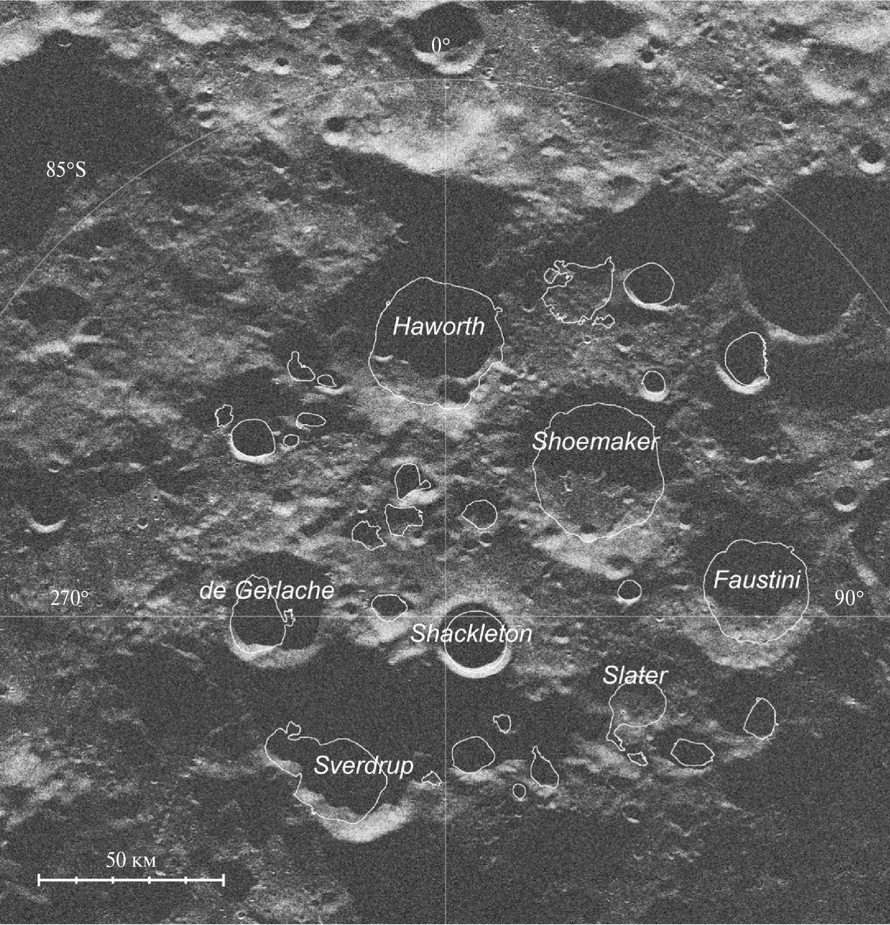 Рис. 4. Радиолокационная карта зеркального компонента эхо-сигнала центральной части южного полярного района Луны. Белыми линиями обозначены границы наиболее крупных постоянно затененных областей. Обозначения кратеров: Haworth (Хауорт), Shoemaker (Шумейкер), Faustini (Фаустини), de Gerlache (Де Герлах), Shackleton (Шеклтон), Slater (Слейтер) и Sverdrup (Свердруп).