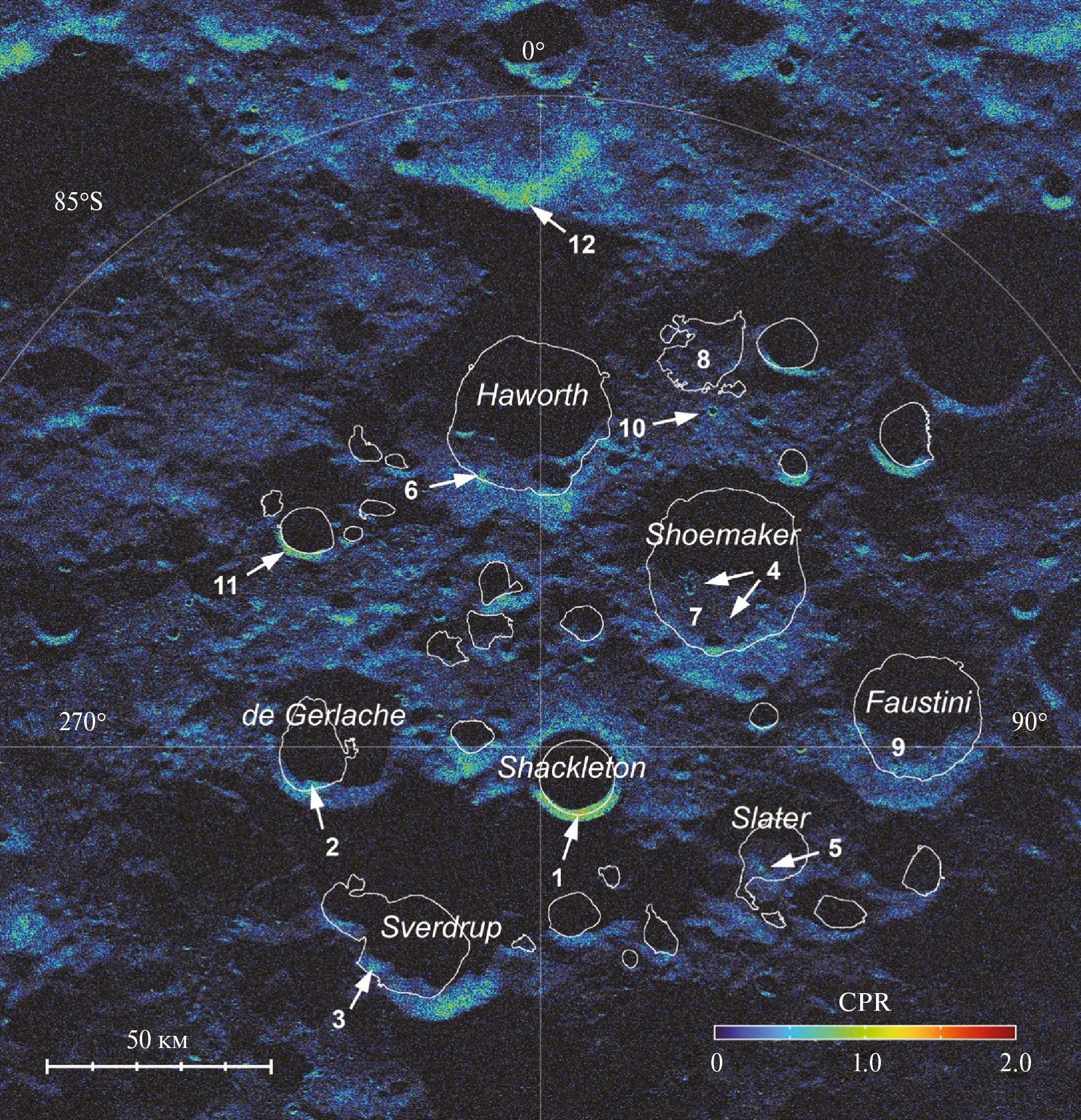На рис. 5 в обозначенных белыми линиями границах не наблюдается больших, протяженных участков с высокими значениями CPR, характерными для льда. Небольшие участки с наибольшими значениями CPR расположены на обращенных к приемнику поверхностях внутренних стен крупных полярных кратеров – Шеклтон, Де Герлах и Свердруп (см. 1–3 на рис. 5), а также на краях и в окрестностях мелких ударных кратеров (см. 4–6). Средние значениями CPR от 0.1 до 0.5 соответствуют гладким поверхностям (см. 7–9). Однако следует отметить, что похожее распределение значений CPR наблюдается и за пределами постоянно затененных областей (см. 10–12).