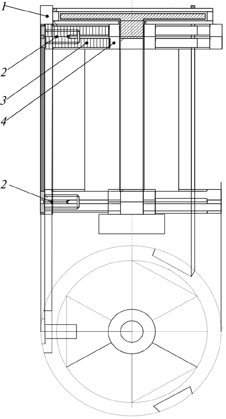 На разрезе (рис. 3) вертикальные детали 1 с помощью винтов 2 приворачиваются к подвесам. Как и прежде, зазор между деталью 3 подвеса и деталью 4, в которой закреплена пробная масса, составляет 30–50 мкм. Штриховкой условно показана подвижная пластина емкостного датчика, а снизу – постоянный магнит. Вся конструкция остается без изменений. Единственное необходимое изменение – немного уменьшить внутренний радиус кольца подвеса на 0.5–0.7 мм и использовать фольгу из БрБ-2 толщиной 10–20 мкм.