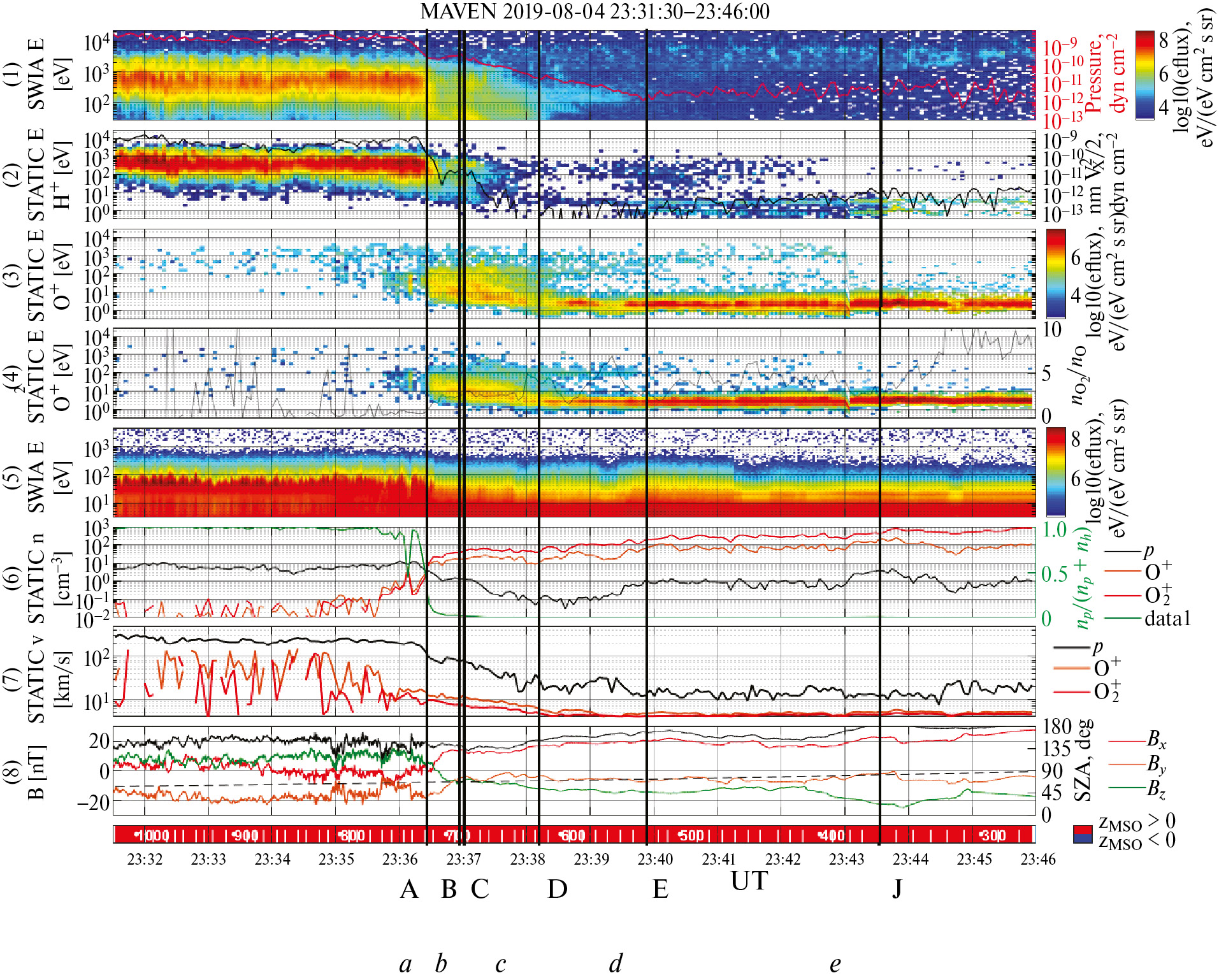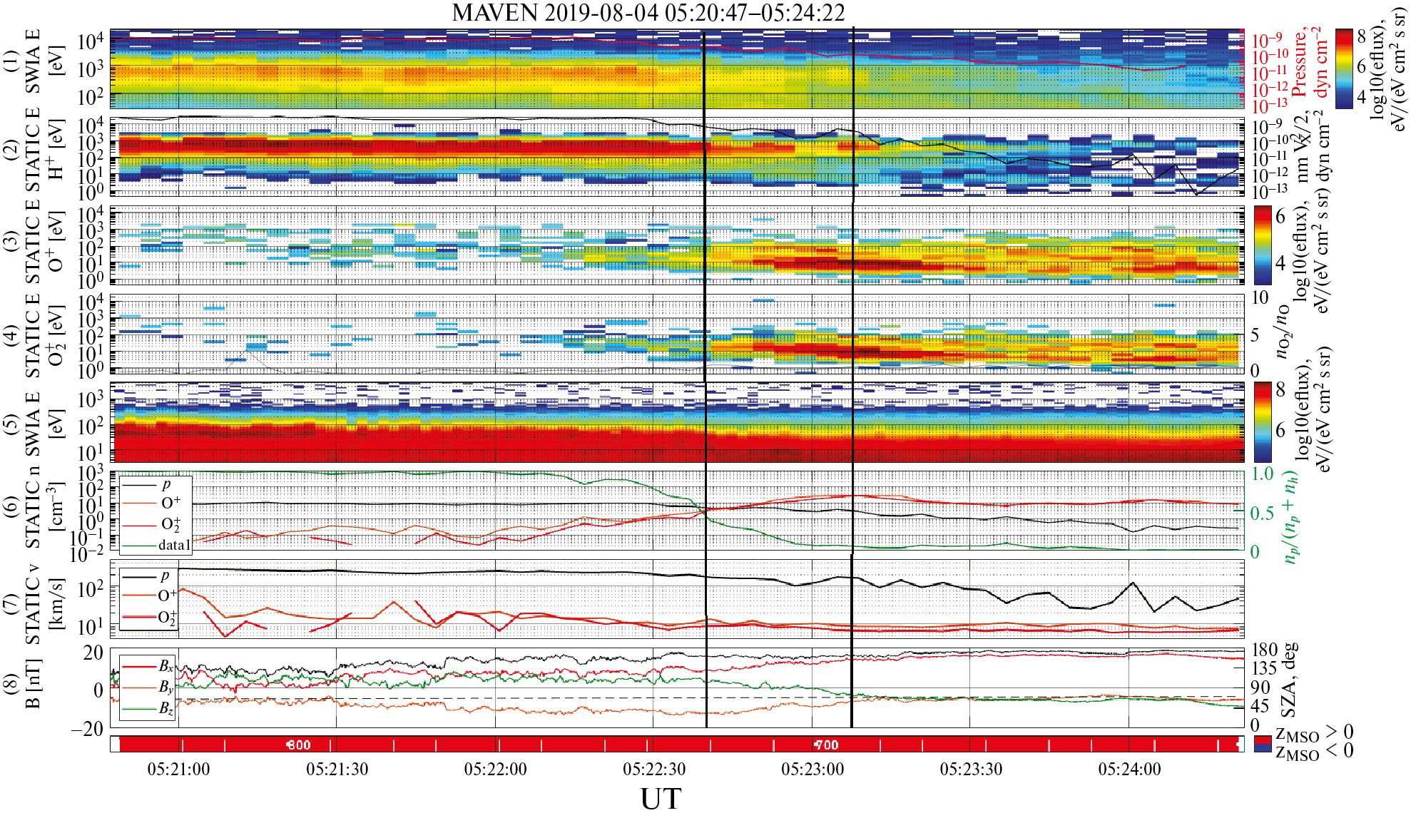Рис. 5. 4 августа 2019 г., в 05:20:47 – 05:24:22 по восточному времени. Данные MAVEN включают магнитослой, магнитопаузу, магнитосферу и ионосферу. Панели сверху вниз: 1 – дифференциальная энергия-время суммы всех ионов; 2 – дифференциальная энергия-время протонов H+; 3 – дифференциальная энергия-время кислорода O+; 4 – энергия-время кислорода O2+; 5 – дифференциальная энергия-время энергии электронов; 6 – цветные линии плотности ионов (в прямоугольнике справа) и а относительная плотность ионов и протонов (линии зеленого цвета); 7 – скорости трех ионов (пояснение в прямоугольнике справа); 8 – компоненты магнитного пола в системе координат Солнечной орбиты, ориентированной на Марс (MSO) пояснения цветов указаны справа, и величина магнитного поля (черная линия). Красная цветовая полоска внизу показывает, что спутник находится в северном полушарии. Вертикальные черные полосы приближенно показывают область магнитопаузы. Сектор между двумя вертикальными линиями указывает место, где происходит вращение магнитного поля.
