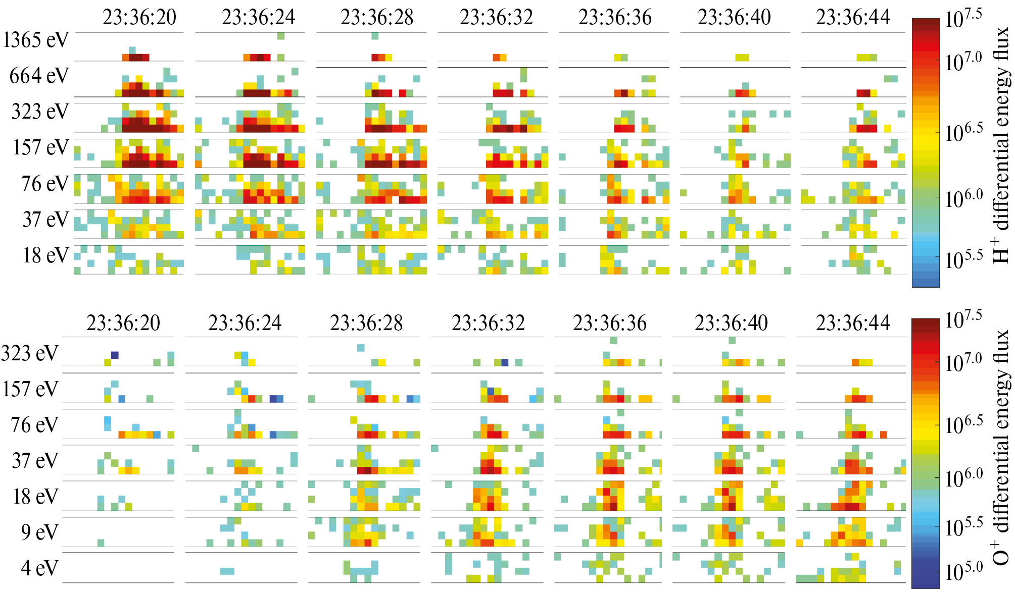 На рис. 8 показаны угловые распределения дифференциальных потоков H+ и O+ во временном промежутке с 05:22:24 UT по 05:23:04 UT в области между магнитослоем и магнитосферой. Верхнее распределение ионов n+ сравнительно ровно уменьшается слева направо, нижнее распределение ионов O+ увеличивается сравнительно ровно от очень малого к значительному распределению. Надо учесть, что ионы O2+ не включены в график, и добавляют более чем вдвое массу, чем O+. Оценка сравнительного в данном случае вклада массы не проводилась, а базируется на динамическом вкладе компонентов.