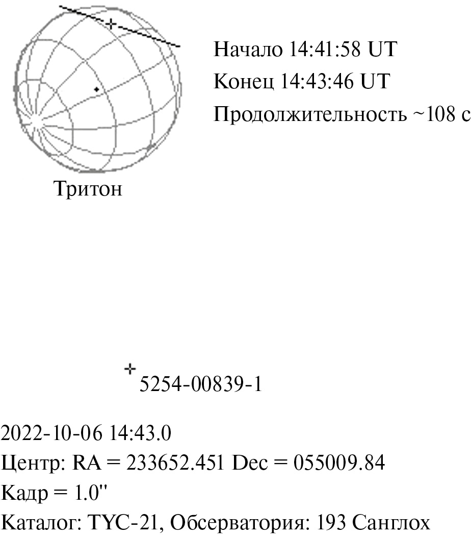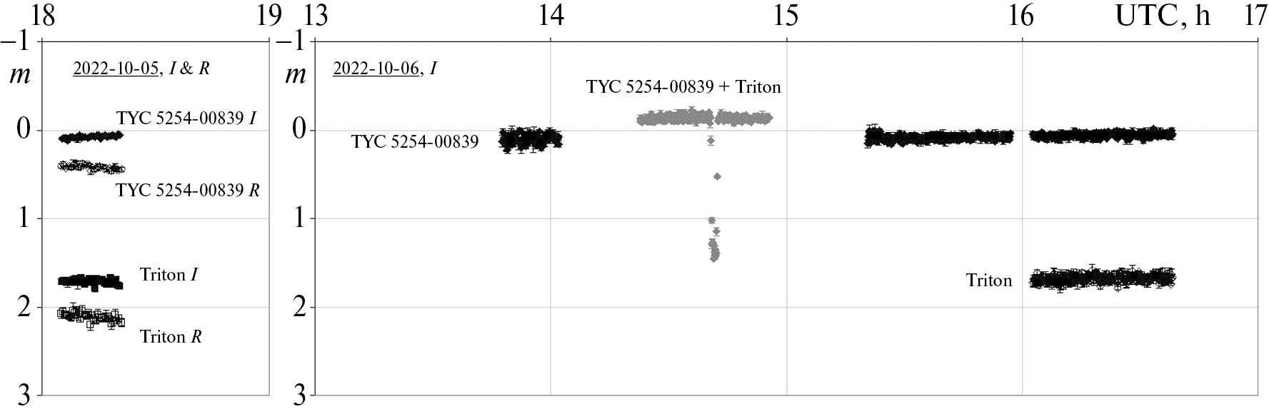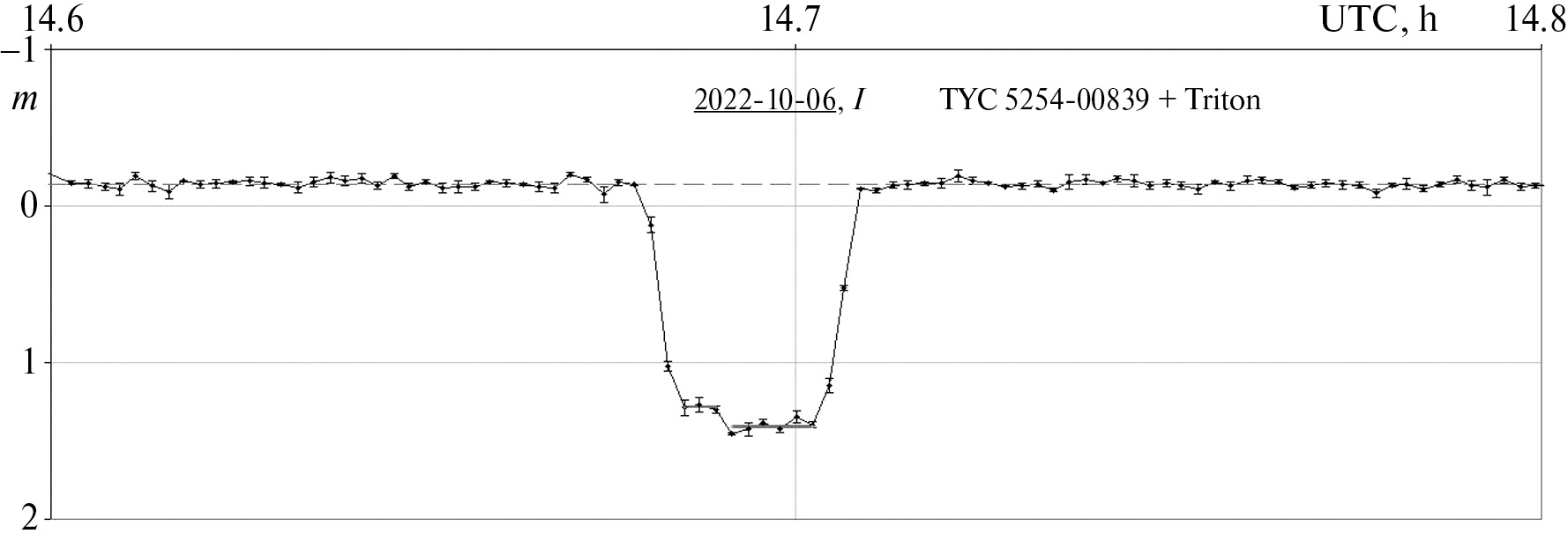 6 октября 2022 г. на Земле наблюдалось покрытие звезды из каталога TYCHO-2 TYC 5254-00839-1 спутником Нептуна Тритоном. Каталог GAIA DR3 содержит следующие координаты этой звезды: α = 23h 36m 52s.448, δ = 03° 50' 09".27 (эпоха J2000). Ее звездная величина в полосе V, в соответствии с данными каталога TYCHO-2, составляет 11.61m. Полоса покрытия протянулась через середину Евразийского континента, проходя через Китай и Таджикистан. Ширина предсказанной траектории тени Тритона от северной до южной границы составила 1353 км (http://occult.mit.edu/research/occultations/Triton /Triton.20221006, 24.06.2023). С учетом того, что явление звездных покрытий является одним из лучших средств исследования атмосфер планет и их спутников, сотрудники Института планетных наук (PSI) Массачусетского технологического института (MIT) и Лоуэлловской обсерватории инициировали организацию мировой наблюдательной кампании, обратившись к астрономам разных стран, включая Таджикистан, с предложением провести наблюдения этого явления. Научными целями наблюдательной кампании являются: уточнение параметров атмосферы Тритона на основе исследования пиков, спадов, “ступеней” или других особенностей кривой блеска; определение положения Тритона относительно небесной системы координат и его эфемериды, необходимых для наблюдений в будущих покрытиях; определение текущего точного эффективного диаметра Тритона. В наблюдательной кампании приняли участие 19 обсерваторий Евразийского континента, среди них обсерватории в Благовещенске (Россия) и на Майданаке (Узбекистан).