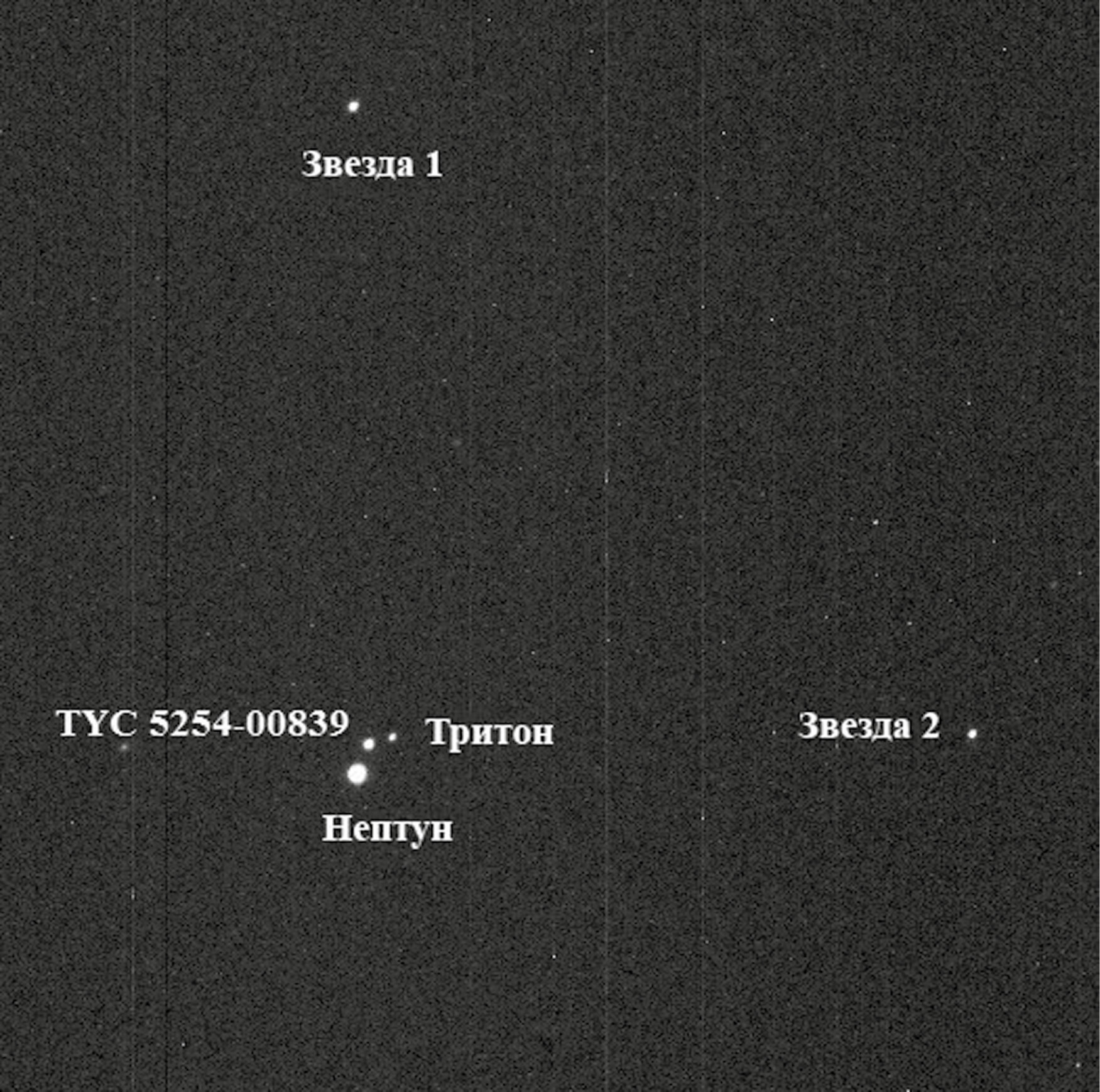 В качестве опорных объектов для дифференциальной фотометрии использовались две наиболее яркие звезды, изображения которых попали на все кадры всех серий наблюдений, а также Нептун. На рис. 2 приведен пример кадра, полученного спустя 1 ч. 50 мин. после явления. На нем подписаны все измерявшиеся объекты.