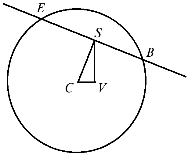 Рис. 6. Чертеж, поясняющий явление покрытия. Круг – видимый диск Тритона, C – его центр. Изображение звезды пересекает диск (позади него) по хорде BE, S – середина хорды, положение звезды в центральный момент покрытия. V – пересечение небесной параллели центра диска и круга склонений точки S.