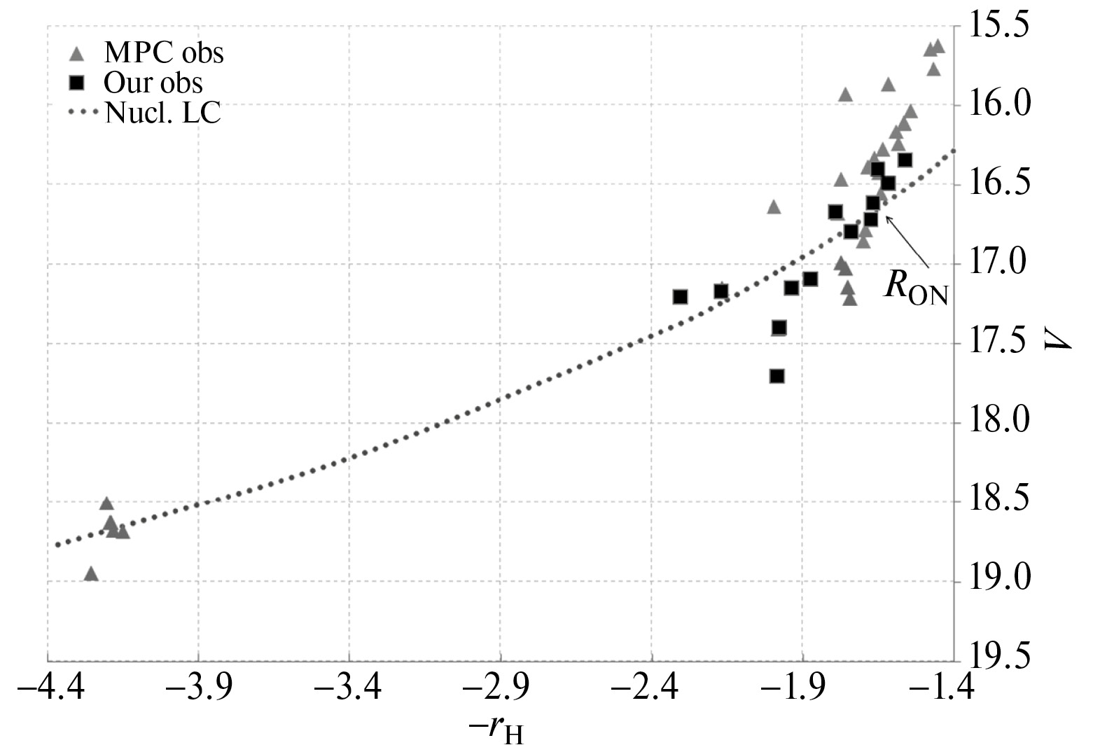 Рис. 2. Кривая блеска кометы 7P/P–W на гелиоцентрических расстояниях rH –4.4 … –1.45 а. е. (минус означает период времени до перигелия, ось X). Показана кривая блеска неактивного ядра (nucl. LC), а также скорректированные к полосе V (ось Y) наблюдения: из базы MPC (MPC obs) и наши собственные (our obs). Стрелочкой показан примерный момент начала активности (RON).