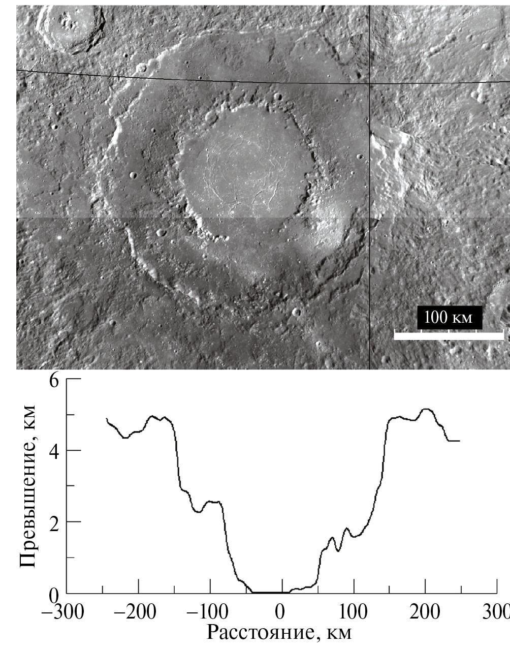 Некоторое представление о том, как выглядят сохранившиеся крупные ударные кратеры, можно получить по изображениям и топографии кратеров Меркурия и Марса (рис. 2, рис. 3). Однако примерно в три раза меньшая сила тяжести на этих планетах требует дополнительного обсуждения геометрии больших кратеров. Профиль кратера на Марсе (рис. 3) сильно изменен более молодыми геологическими процессами, включая образование более молодых кратеров, однако положение внутреннего кольца все еще заметно. Для иллюстрации того, каким мог быть начальный профиль кратера, на нижнем рисунке пунктиром показан профиль более молодого и лучше сохранившегося кратера Лио (Lyot, D ~ 200 км) глубиной ~4 км, сравнимой с глубиной кратера на Меркурии, показанного на рис. 2.