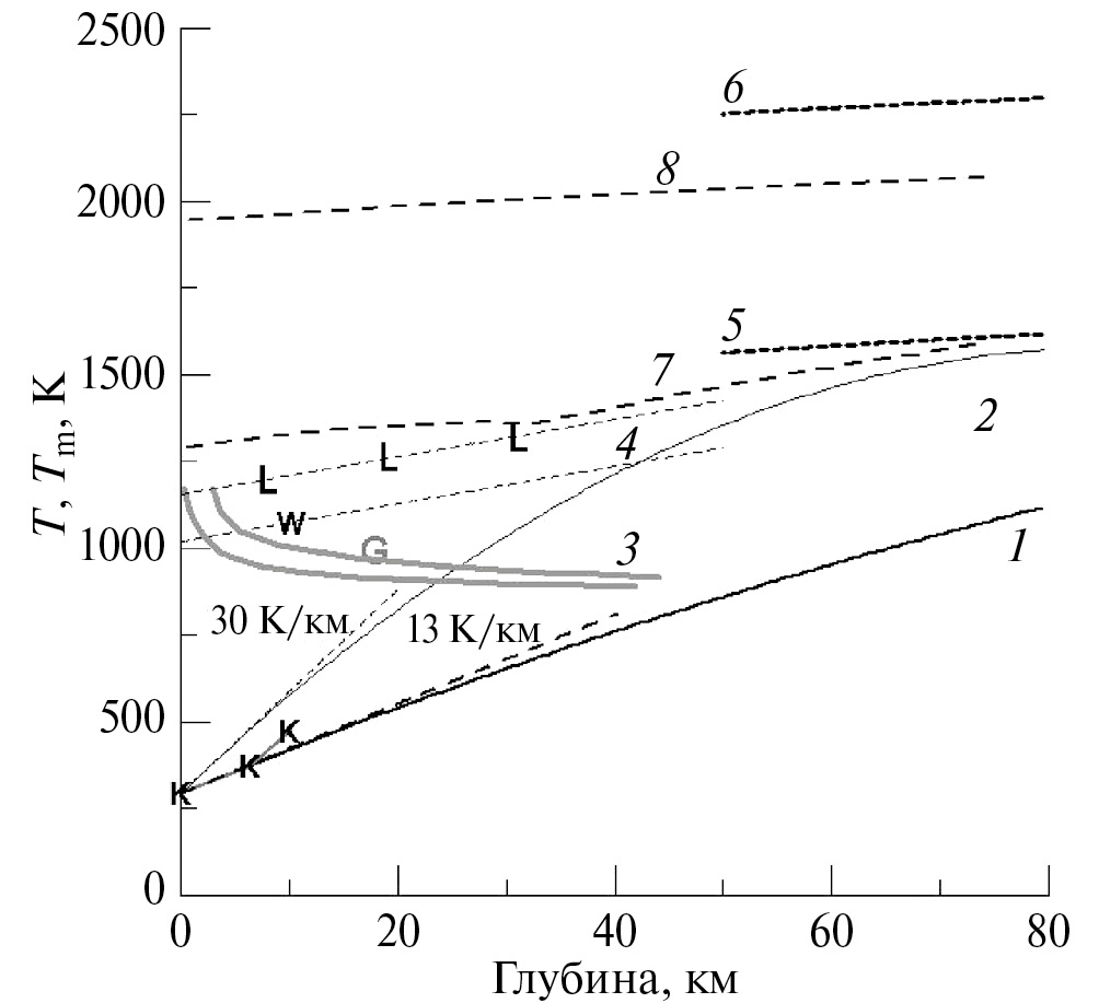 Рис. 4. Примеры геотерм с относительно низкими (1 – “холодный” случай) и относительно высокими (2 – “горячий” случай) предполагаемыми приповерхностными градиентами температуры; 3 – ликвидус и солидус для водонасыщенного гранита (Boettcher, Wyllie, 1968), “G” –экспериментальная точка из (Goetze, 1971); 4 – то же для сухого гранита, “L” – точки ликвидуса из (Dell’Angelo, Tullis, 1988), “W” – гранит из (Rutter, Neumann, 1995). Пунктирные линии 4 аппроксимируют данные для ликвидуса Tliq (K) = 1156 + 5.41 z (км) и солидуса гранита Tsol= 1020 + 5.41 z. Знаки “K” иллюстрируют температурный градиент в кольской сверхглубокой скважине (Popov и др., 1999). 5 и 6 – оценочное положение солидуса для верхней мантии (5 – фаялит, 6 – форстерит).