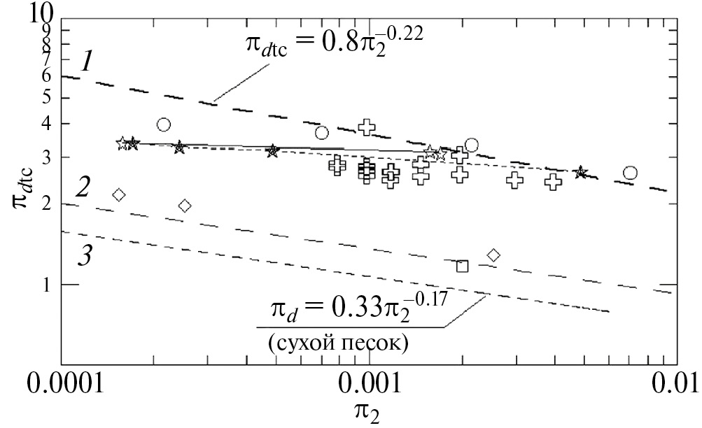 Рис. 6. Расчетные точки для глубины переходного кратера в однородной мишени с сухим трением (Ivanov, Kamyshenkov, 2012) в сравнении с результатами данной работы. Использованы те же значки, что и на рис. 5. 1 – обобщенная зависимость от масштаба глубины переходного кратера в однородной мишени без прочности (Schmidt, Housen, 1987). 2 – расчетная зависимость для низкоскоростных ударов в мишень с сухим трением (Ivanov, Kamyshenkov, 2012). 3 – обобщенная экспериментальная зависимость глубины кратеров в сухом песке (Schmidt, Housen, 1987).