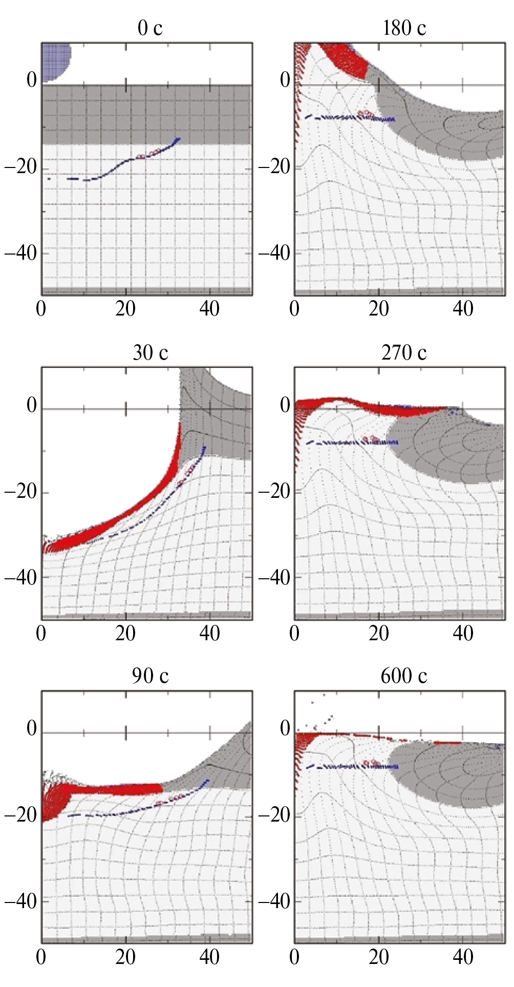Полная временная последовательность процесса образования кратера была описана ранее (см., например, Иванов, 2005). Для кратера Вредефорт наиболее подходящий модельный набор параметров при вертикальном ударе включает астероид диаметром 14 км при скорости удара 15 км/с. Из точки удара распространяется ударная волна, и переходный кратер начинает расти в материале мишени, механически поврежденном ударной волной. Для модельного кратера Вредефорт примерно через 30 с после удара переходный кратер достигает максимальной глубины и начинает обрушаться в поле тяжести. Центральная часть околократерного течения показана на рис. 7, где расплавленный материал показан красным цветом лагранжевых трассеров, нагретых выше 1700 К. В показанном на рис. 7 варианте использован ударник диаметром 14 км, вертикально падающий на мишень со скоростью 15 км/с. Область расчета покрыта эйлеровой сеткой с размером ячеек 0.7 × 0.7 км. В каждую ячейку с материалом изначально помещен лагранжев трассер, который “записывает” давление, плотность и температуру в ячейке. Визуализация деформации мишени сделана с помощью черных точек для каждого десятого ряда и каждой десятой колонки изначального положения трассеров. Трассеры, “записавшие” температуру 1700 К и выше, показаны как красные точки и примерно показывают геометрию зоны расплава (температура выше солидуса). Цепочка синих трассеров состоит из трассеров, которые в конечной геометрии образуют будущую поверхность эрозии на глубине 8 км ниже начального уровня поверхности. В данном варианте используется трехслойная модель мишени – верхняя кора (темно-серый тон), нижняя кора (более светлый тон) и мантия (более темный тон глубже 50 км).