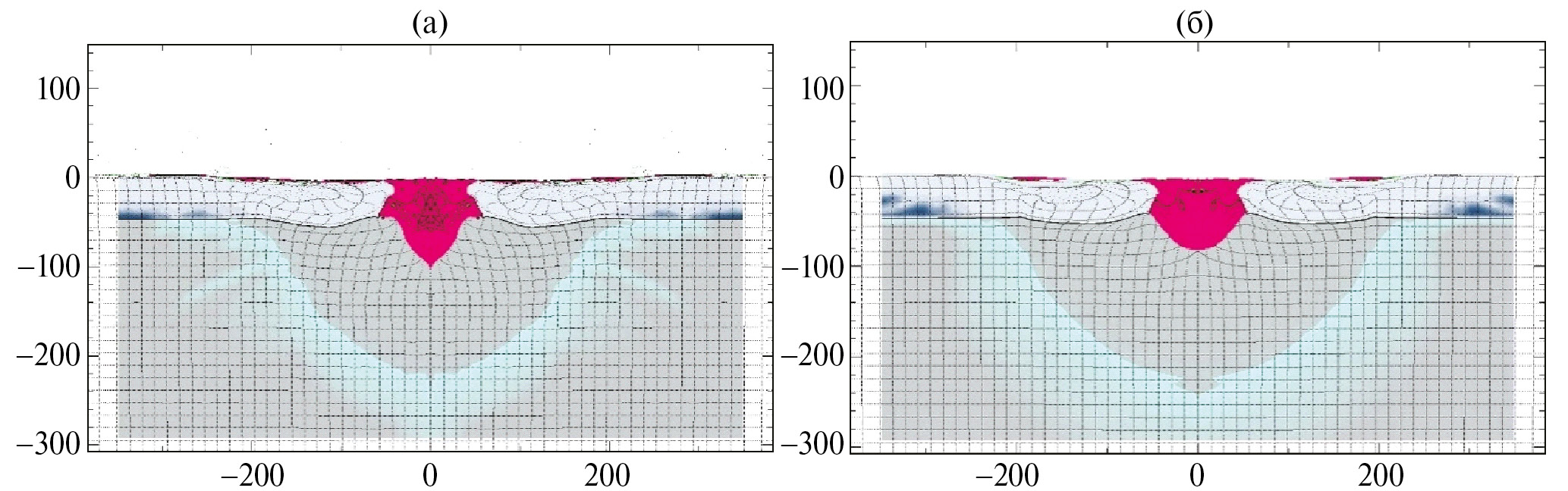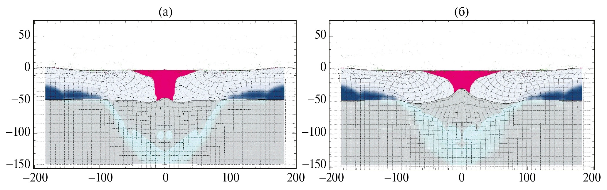 Отметим, что в течение расчетных ~1000 с движение вещества в расплавленной зоне еще не прекращается – можно наблюдать медленное гравитационное разделение расплавленного материала коры меньшей плотности и более плотного расплава вещества мантии. Для этого масштаба ударного события окончательная геометрия зоны плавления установится после длительного теплового охлаждения с возможной дифференциацией новых горных пород, кристаллизующихся из ударного расплава.