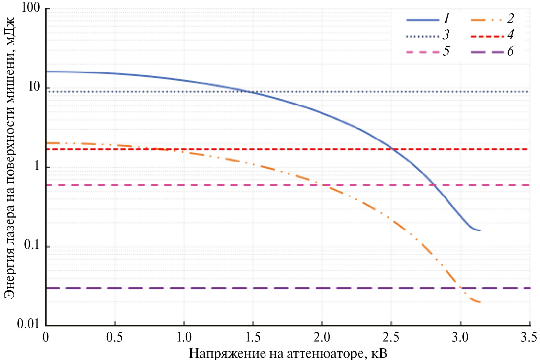 Рис. 3. Энергетические характеристики лазерного излучения на поверхности мишени: 1 – энергия лазерного излучения без нейтрального фильтра НС3; 2 – энергия лазерного излучения с нейтральным фильтром НС3; 3 – уровень энергии, необходимый для ионизации чистого льда; 4 – уровень энергии, необходимый для ионизации льда с примесью 1% TiH2; 5–6 – зона номинальных энергий, оптимальных для работы с различными породами, в том числе с реголитом Луны.