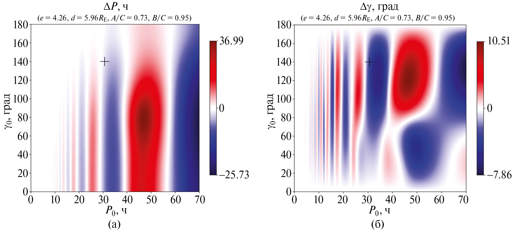 Рис. 2. Изменение вращательного состояния Апофиса из-за сближения с Землей в 2029 г. в зависимости от P0 и γ0: (а) – изменение ΔP периода вращения; (б) – изменение Δγ угла, характеризующего отклонение оси вращения Апофиса от нормали к плоскости орбиты. Крестиком указано положение Апофиса согласно данным из табл. 1.