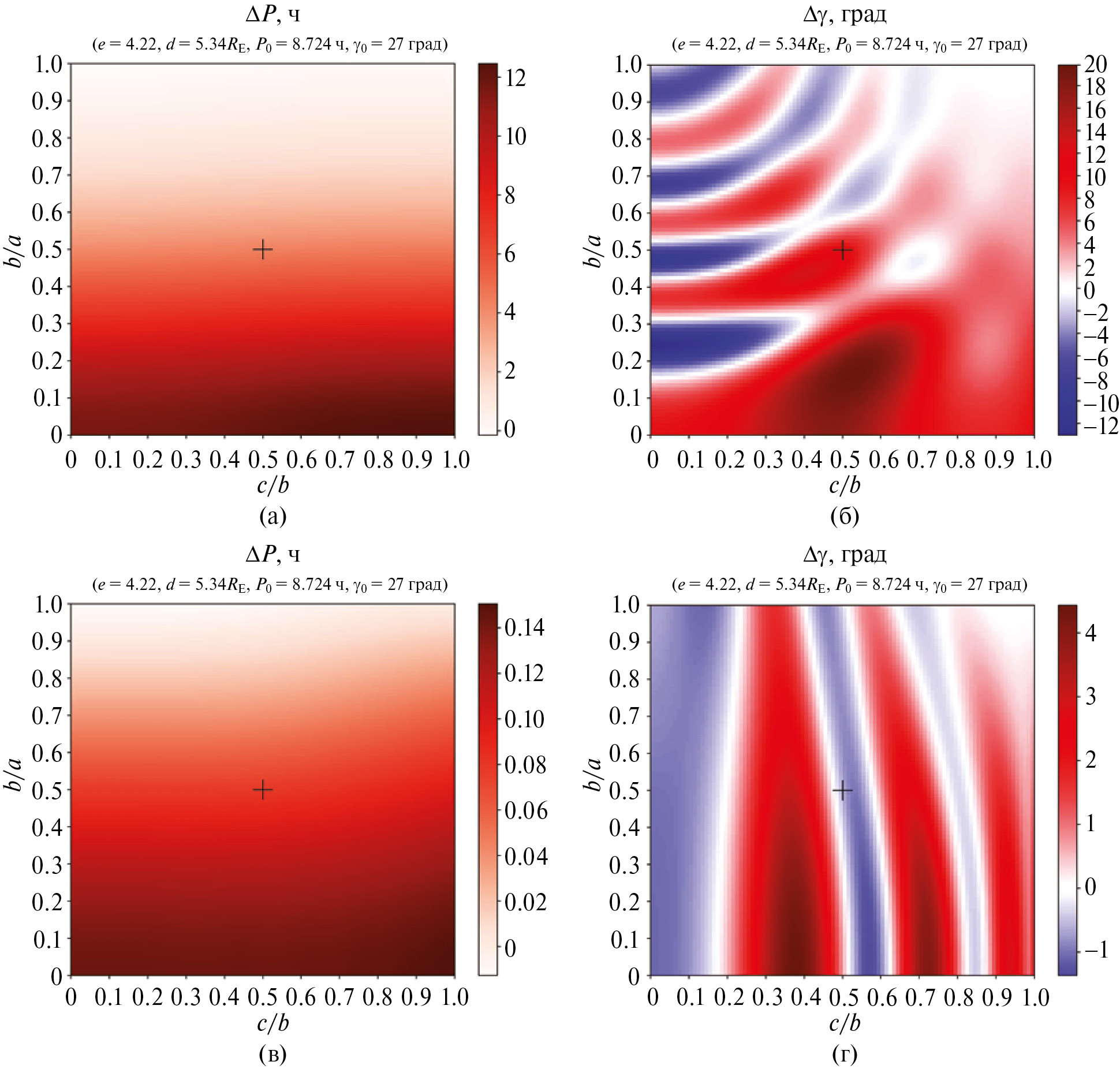 Рис. 6. Изменение вращательного состояния астероида Дуэнде из-за сближения с Землей в 2013 г. в зависимости от параметров c/b и b/a, характеризующих фигуру астероида: (а) – изменение ΔP периода вращения при γ0 = 27°; (б) – изменение Δγ угла, характеризующего отклонение оси вращения астероида от нормали к плоскости орбиты, при γ0 = 27°; (в) – изменение ΔP при γ0 = 160°; (г) – изменение Δγ при γ0 = 160°. Принятые параметры орбиты (e, d) и начальные параметры вращения астероида (P0, γ0) приведены на рисунках. Крестиком указано возможное положение Дуэнде (см. Мельников, 2022).