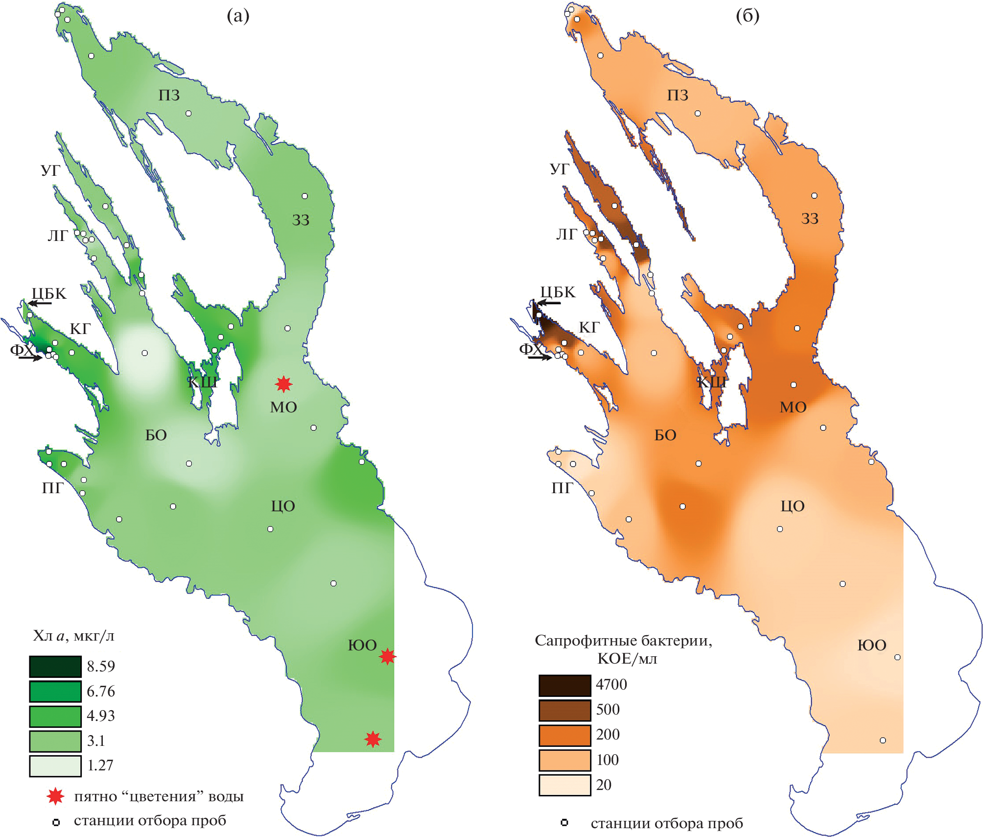 The trophic state and water quality of Lake Onegо were assessed under climate warming and changes in anthropogenic load over the past 30 years. The water body retains its natural oligotrophic state during the summer stratification according to the concentration of chlorophyll a. A small amount of readily mineralizable organic matter in water determines the low level of development of saprophytic bacteria, corresponding to xenosaprobic and β-oligosaprobic waters. Only the Kondopogskaya Bay of Lake Onego is characterized by a higher level of trophy (mesotrophic) and water saprobity (β-mesosaprobic) due to pollution by wastewater from the pulp and paper mill and waste from trout farms. Local “bloom” of cyanobacteria of in the open area of the lake was observed during the anomalous heating of the epilimnion in the summer of 2022 for the first time in the 50-year history of research. The increase in the concentration of humic substances in the water of the bays as a result of climate warming at this stage did not lead to a change in the level of saprophytic bacteria.