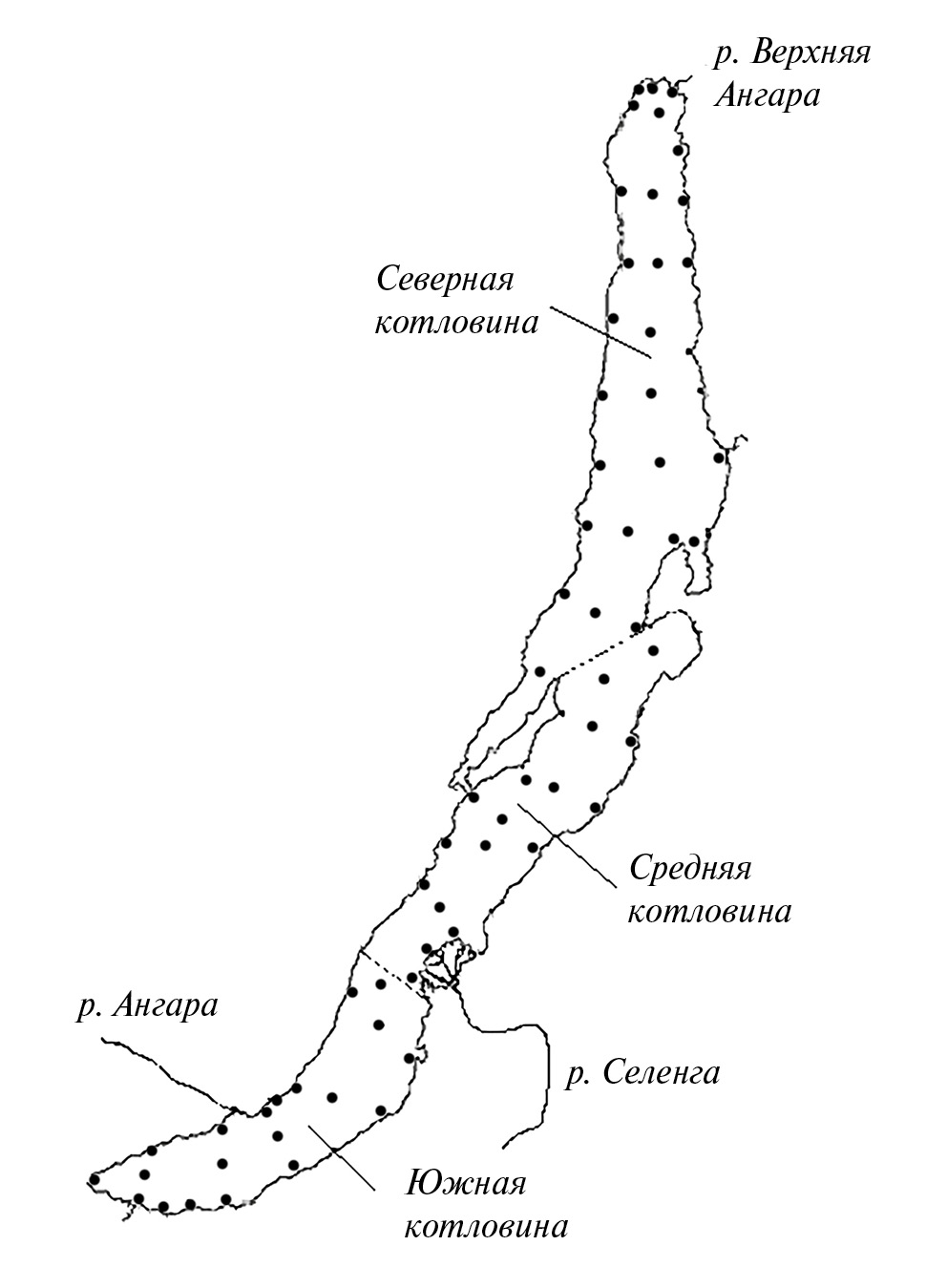 Рис. 1. Карта-схема расположения станций по акватории оз. Байкал. Пунктирными линиями обозначены границы котловин. ●– станция.
