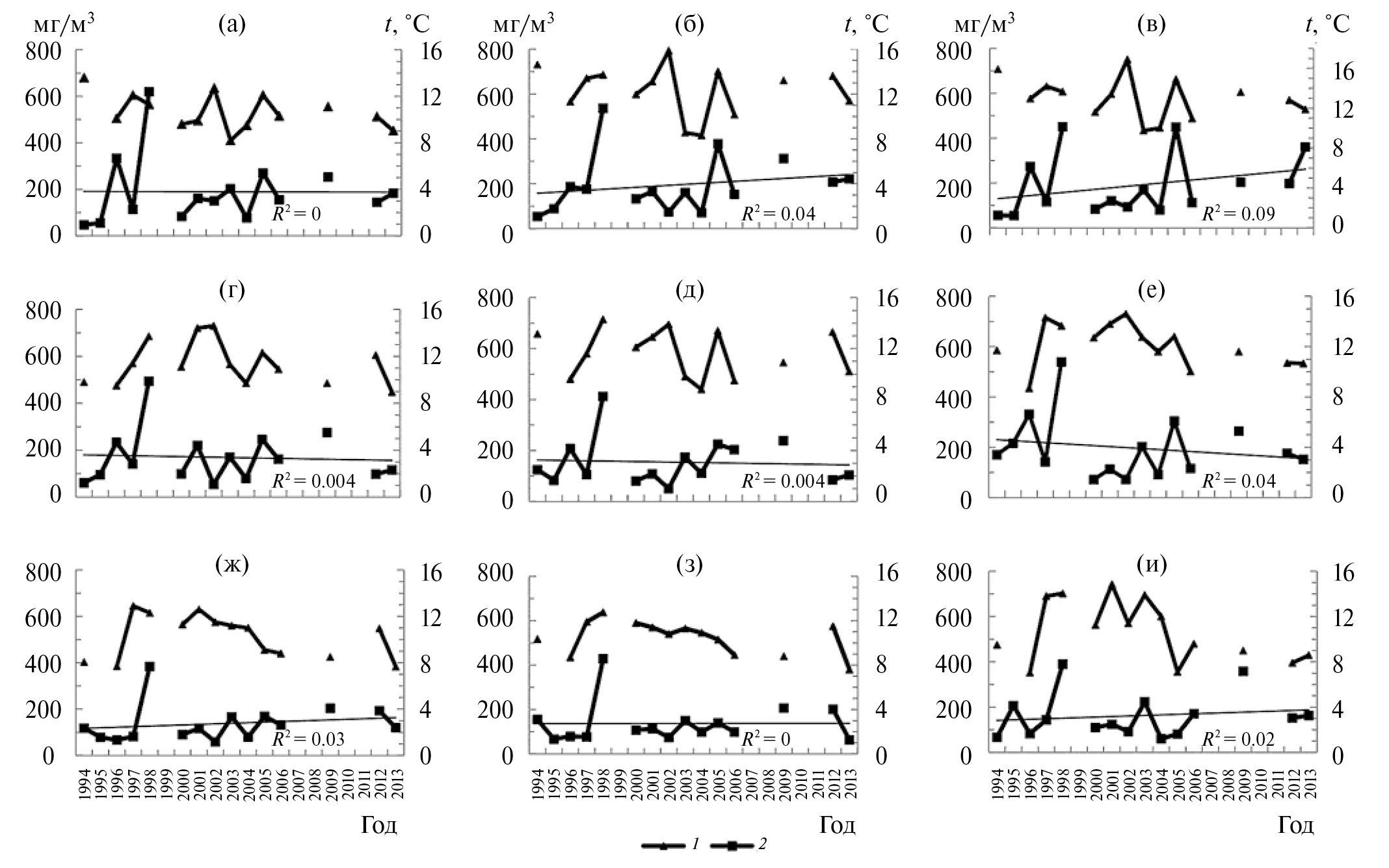 Рис. 2. Межгодовая динамика температуры воды (1) и общей биомассы фитопланктона (2) в слое воды 0–10 м в Южном Байкале: в пелагиали (а), у западного (б) и восточного (в) берегов; в Среднем Байкале: в пелагиали (г), у западного (д) и восточного (е) берегов; в Северном Байкале: в пелагиали (ж), у западного (з) и восточного (и) берегов в период позднего лета. (R2 – достоверность аппроксимации).