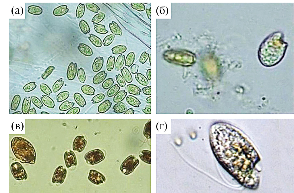 Рис. 1. Микрофотографии исходных клеток: a —живые клетки Tetraselmis sp. из микроценоза заплескового временного водоема (Tetraselmis sp. + Oxyrrhis marina); б — живые клетки Tetraselmis sp. и O. marina из природного водоема; в — клетка O. marina с Tetraselmis sp. внутри и свободные клетки Tetraselmis sp. после фиксации Люголем; г — живая клетка O. marina из лабораторной культуры.