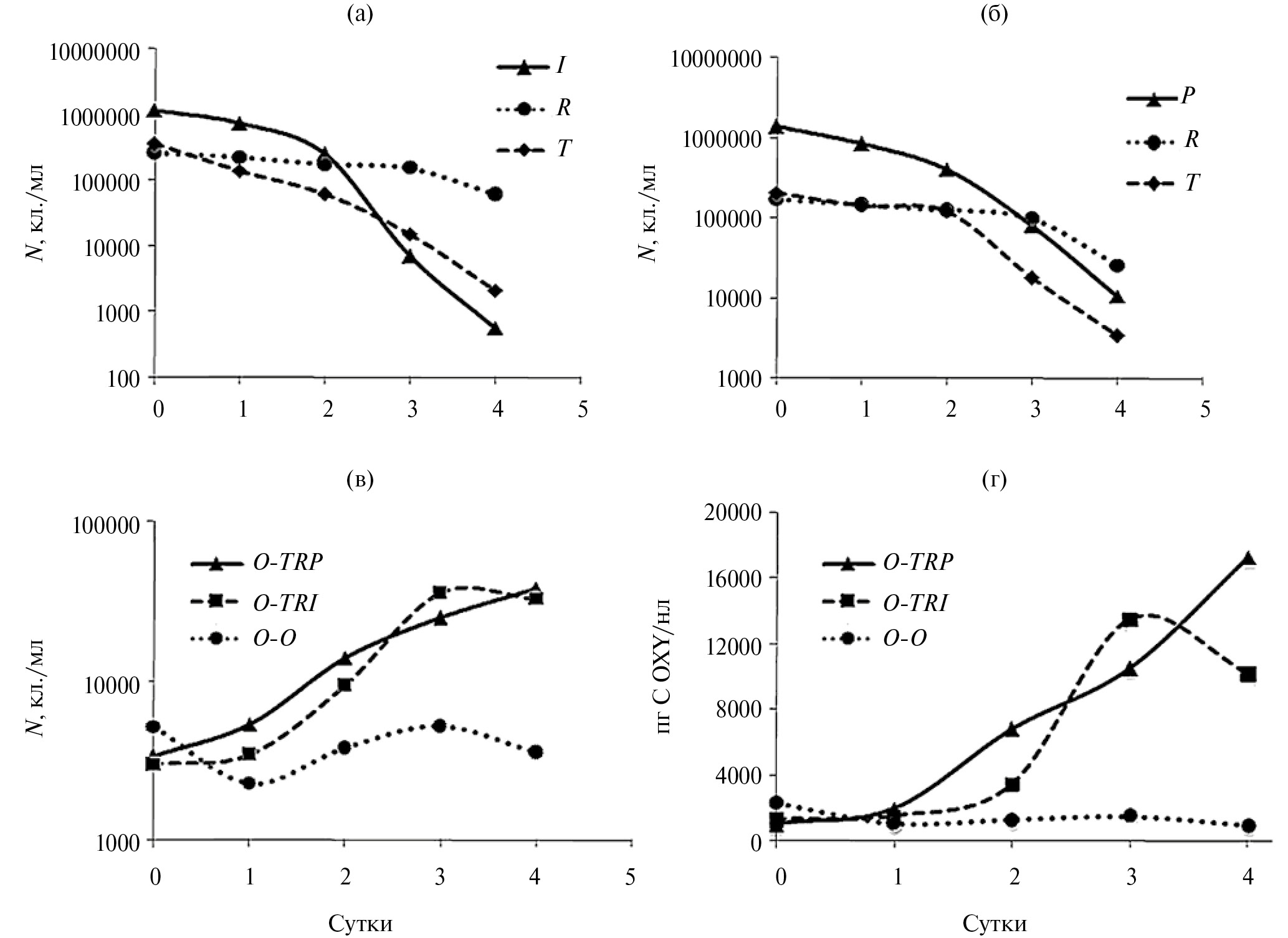 Рис. 4. Динамика изменения численности клеток (кл./мл) микроводорослей в трехкомпонентных смесях TRI (а) и TRP (б); динамика изменения численности клеток Oxyrrhis marina (кл./мл) в смесях TRI и TRP и в отсутствие микроводорослей (O-O) (в); динамика изменения углеродного эквивалента биомассы O. marina в смесях TRI и TRP и в отсутствие микроводорослей (O-O) (г). Здесь и на рис. 5, 6: I — Isochrysis galbana; N — численность; O — Oxyrrhis marina, P –Phaeodactylum tricornutum, R — Rhodomonas salina, T — Tetraselmis suecica.