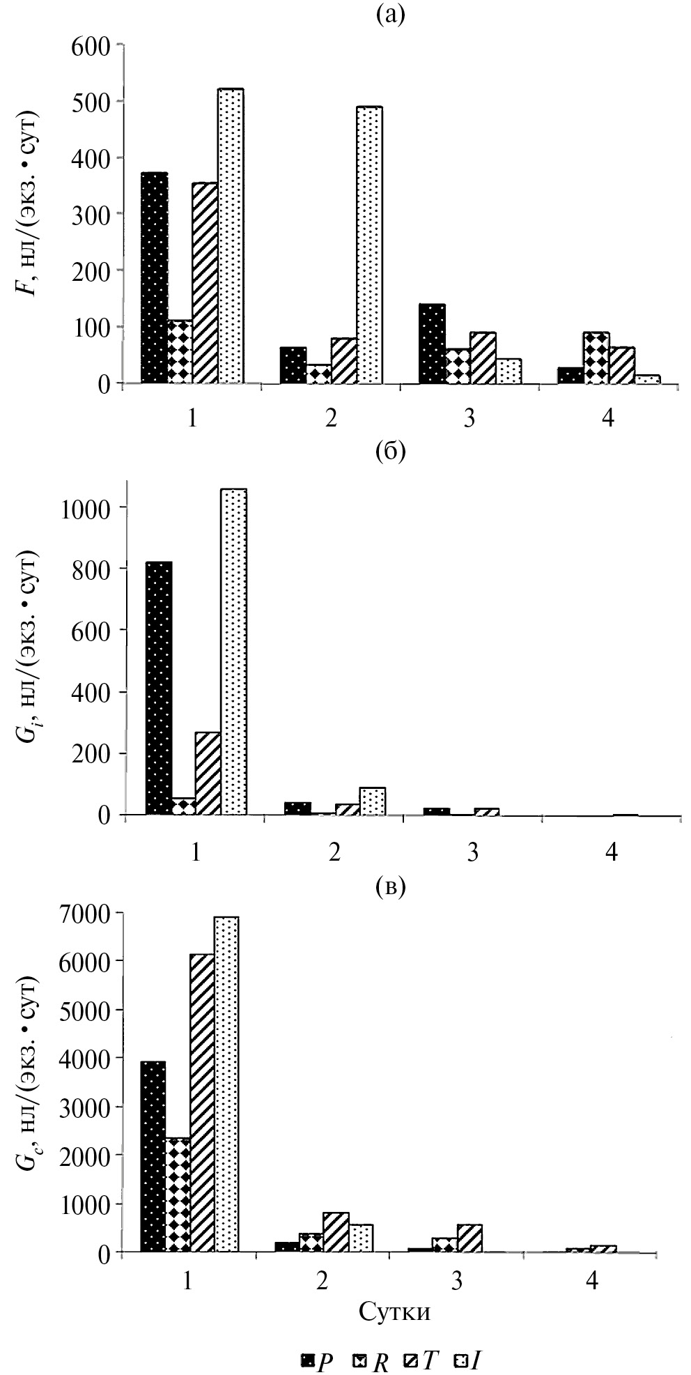 Выраженная в углеродных единицах скорость потребления микроводорослей динофлагеллятами OXY–IBSS в 1-е сут эксперимента в условиях повышенных концентраций микроводорослей, также оказалась достоверно более высокой (P <0.05) при питании I (3.9 нг С/ (экз. · сут) (рис. 5в), и достоверно более низкой — при питании смесью микроводорослей TRP (1.5 нг С/(экз. · сут)) (P <0.05). Суточная скорость потребления углерода динофлагеллятами в остальных экспериментальных условиях варьировала от 2.3 (R) до 3 нг С/(экз. · сут) (P).