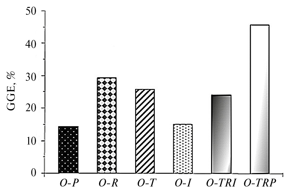 Рис. 7. Эффективность использования углерода потребленных микроводорослей на прирост углеродного эквивалента биомассы гетеротрофных динофлагеллят O. marina (GGE, %) при питании в однокомпонентных смесях (O–P — Phaeodactylum tricornutum; O–R — Rhodomonas salina; O–T — Tetraselmis suecica; O–I — Isochrysis galbana) и в трехкомпонентных смесях микроводорослей (O–TRI — Tetraselmis suecica, Rhodomonas salina, Isochrysis galbana и O–TRP — Tetraselmis suecica, Rhodomonas salina, Phaeodactylum tricornutum).