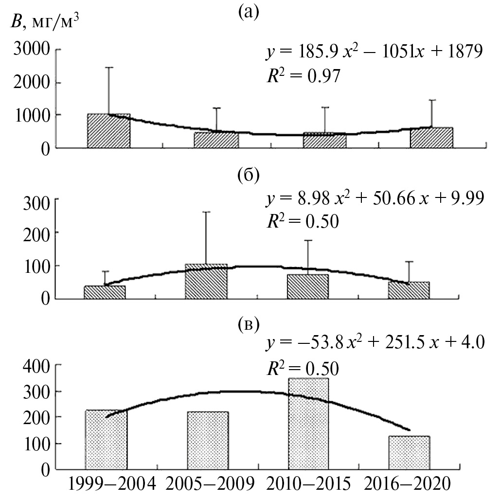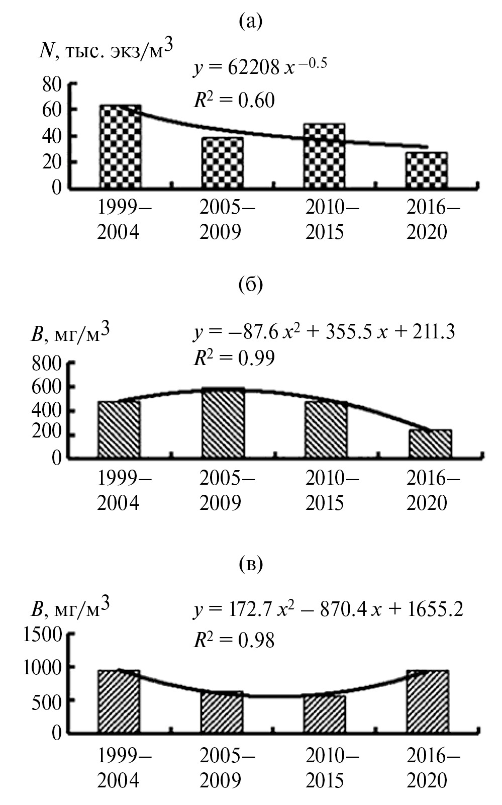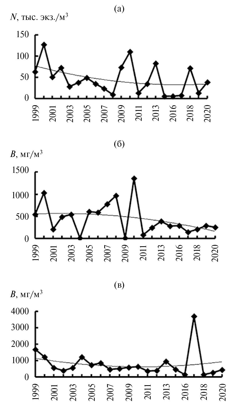 Рис. 5. Тренды многолетних изменений численности (N) Rotifera (а) и биомассы (В) Cladocera (б) и Copepoda (в) в Вислинском заливе в 1999–2020 гг.
