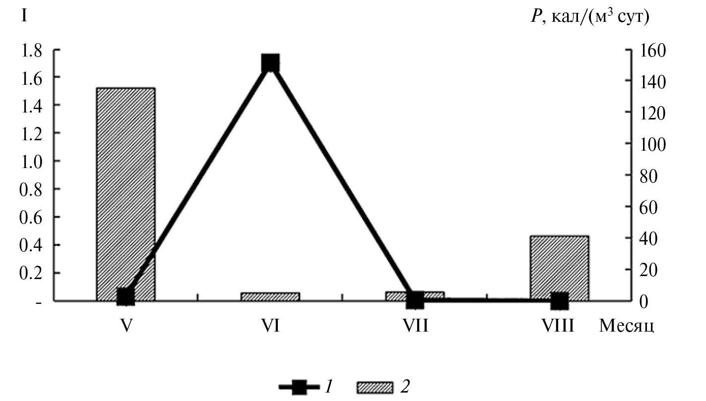 Рис. 8. Среднемесячная (май–август) динамика Импакт-индекса I (1) и суточной продукции P (2) Eurytemora affinis в Вислинском заливе (1999–2020 гг.).