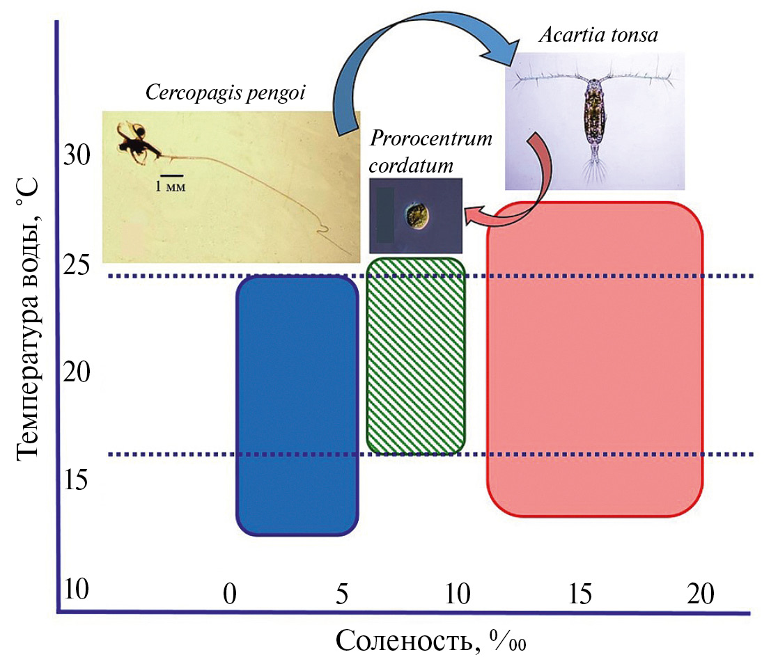 Рис. 9. Концептуальная модель трофических взаимодействий (стрелки) и относительных размеров экологических ниш (солености, температуры воды) хищных ветвистоусых рачков Cercopagis pengoi (фото И.В. Телеш; линейка 1 мм), потенциально токсичных динофлагеллят Prorocentrum cordatum (фото из открытых источников; 20 мкм) и веслоногих ракообразных Acartia tonsa (фото Л.С. Светличного) в Балтийском море. Пунктиром отмечен диапазон перекрывания температурных ниш видов.