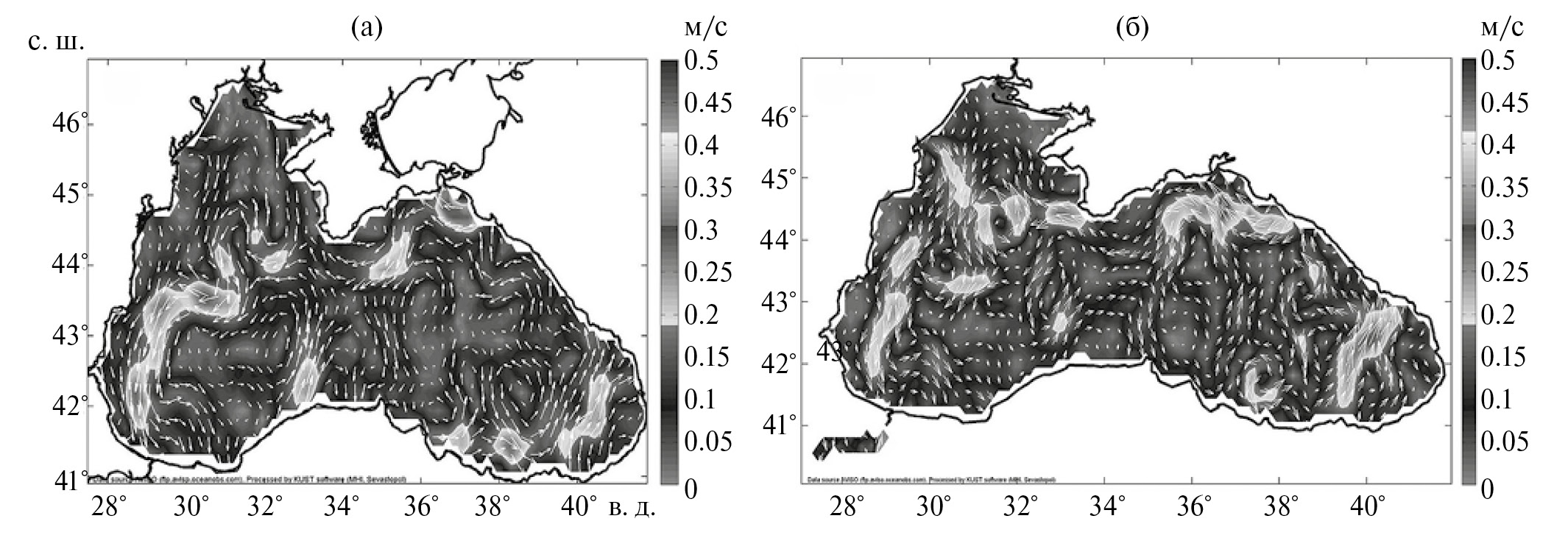 Рис. 2. Расчетные схемы геострофических течений в период исследований: август 2019 г. (а), октябрь 2020 г. (б) (Морской…, 2022). На цветовой шкале показано соответствие цифровых значений динамических скоростей геострофических течений определенным цветам.