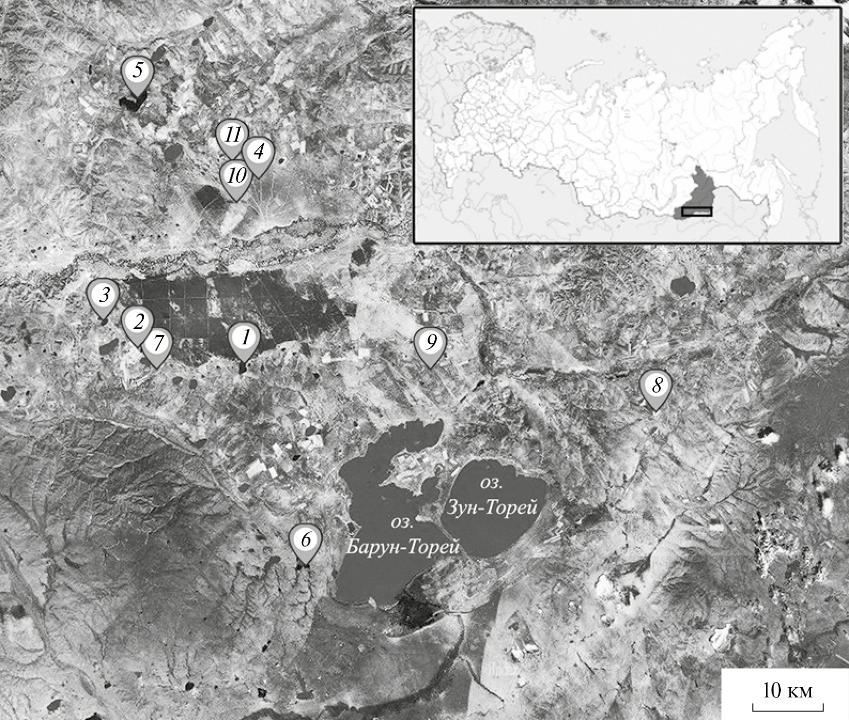 Рис. 1. Карта-схема района исследований. Озера: 1 – Байн-Цаган, 2 – Байм-Булаг, 3 – Балыктуй, 4 – Куджертай, 5 – Ножий, 6 – Нижний Мукей, 7 – Укшинда, 8 – Борзинское, 9 – Дабаса-Нор, 10 – Горбунка, 11 – Хилганта.