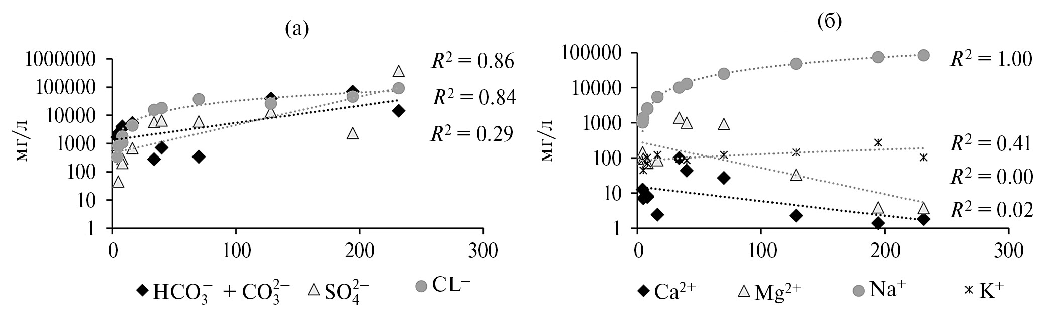 Рис. 2. Связь солености (TDS, г/л) с содержанием основных анионов (а) и катионов (б) (мг/л).