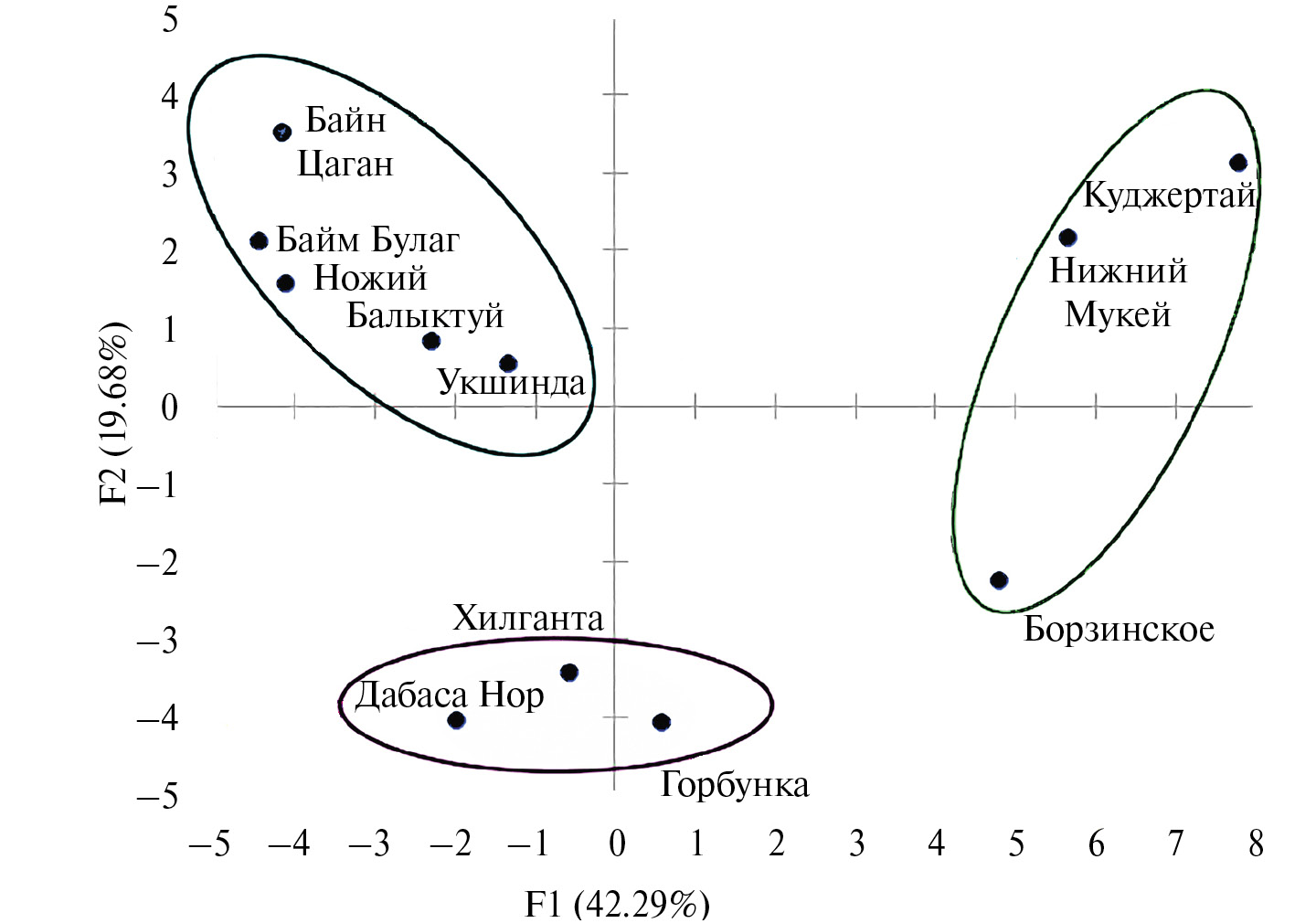 Для выявления взаимосвязи параметров среды и биоразнообразия исследованных озер проведен факторный анализ методом главных компонент. По результатам ориентации озер на плоскости первого и второго факторов (рис. 3), выделено три группы озер. Первая включает олиго-мезогалинные непересыхающие озера содового типа, вторая — наполняющиеся, гипергалинные содовые озера, третья — эу-гипергалинные хлоридные озера.
