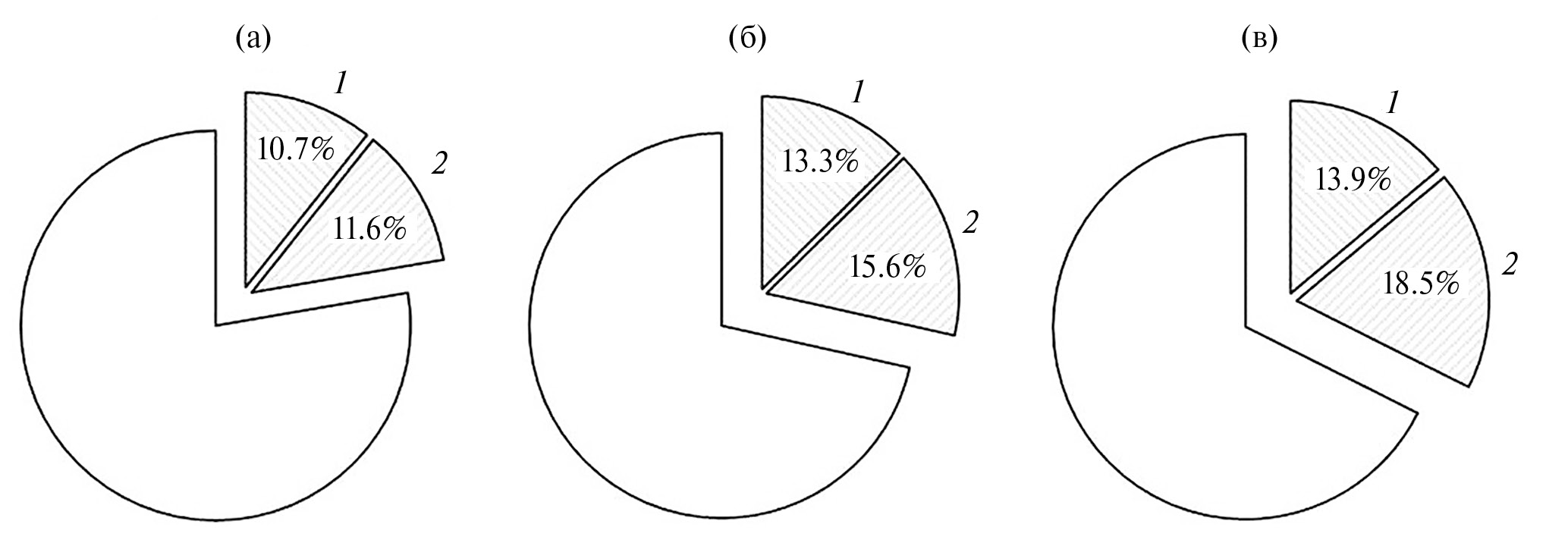 Рис. 1. Относительные величины масс мягких тканей у разноразмерных групп моллюсков Cerastoderma glaucum и Flexopecten glaber ponticus. 1 – церастодерма; 2 – гребешок. Размерные группы (диапазон для обоих видов): группа I (а) – 12–17 мм; группа II (б) – 17–24 мм; группа III (в) – 23–30 мм.