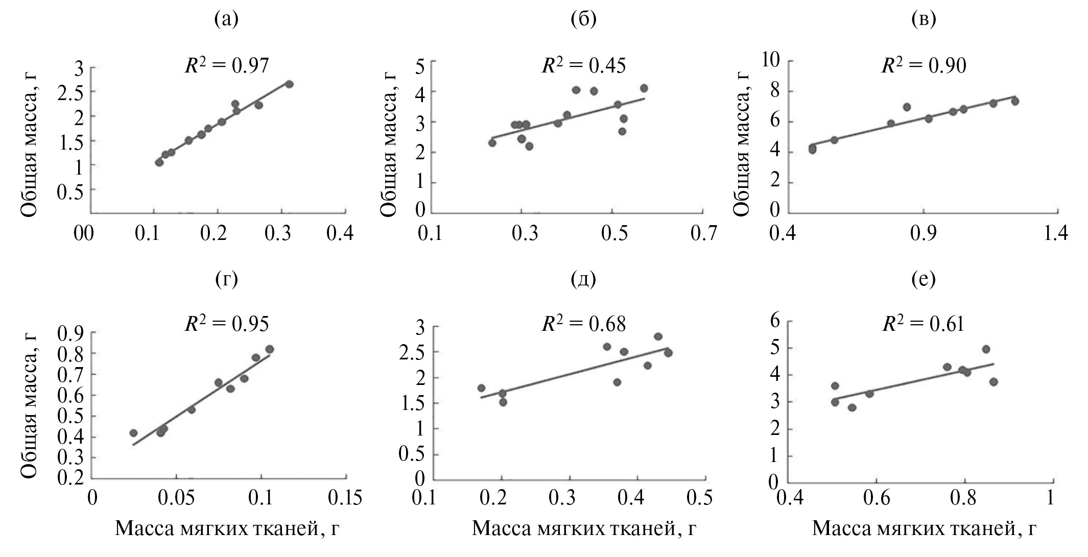 Рис. 3. Характер зависимости между массой мягких тканей и общей массой у моллюсков Cerastoderma glaucum (а–в) и Flexopecten glaber ponticus (г–е). Размерные группы (диапазон для обоих видов): группа I (а, г) –12–17 мм, группа II (б, д) – 17–24 мм, группа III (в, е) – 23–30 мм.
