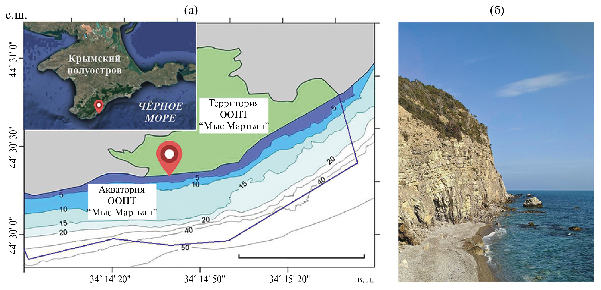 Гидроботаническое исследование выполнено в прибрежно-морской акватории ООПТ “Мыс Мартьян”, функционирующей в структуре Никитского ботанического сада (с 1973 г. в статусе государственного природного заповедника, ныне по факту в статусе природного парка) (рис. 1а). В его границах мониторинг состояния макрофитобентоса в летний период проводят непрерывно с момента организации. Проанализированные в настоящей работе гидроботанические материалы собраны в 2019–2020 гг. посезонно (17.05.2019, 28.08.2019, 19.11.2019, 26.02.2020) в рамках выявления полного годового цикла макрофитобентоса аквального компонента территориально-аквальной экосистемы. Стационарный мониторинговый профиль (координаты в точке пересечения уреза воды — 44°30’20.3 c.ш., 34°14’40.4 в.д.) расположен у подножья 20-метрового абразионного клифа, сложенного верхнеюрскими известняками и сцементированными брекчиями (Панин, 1979) и окаймленного узким глыбово-валунным пляжем (рис. 1б). Дно приглубое, вплоть до глубин 8–10 м (местами до 12 м) сложено глыбовым и глыбово-валунным навалом, за которым простираются пески с незначительной примесью ракуши.