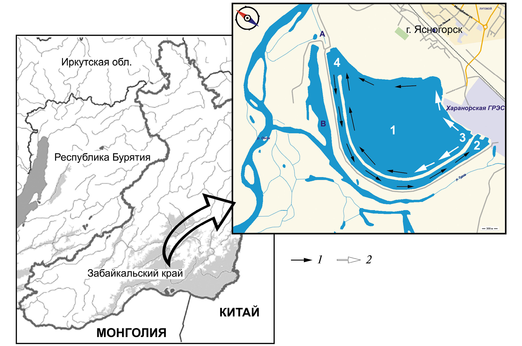 Рис. 1. Схема водохранилища-охладителя Харанорской ГРЭС. A — водоподводящий канал, B — дренажный канал. Станции отбора проб: 1 – центр, 2 – водозаборный канал, 3 – водосбросный канал, 4 – береговая насосная станция. 1 – охлаждение воды, 2 – подогретые воды.