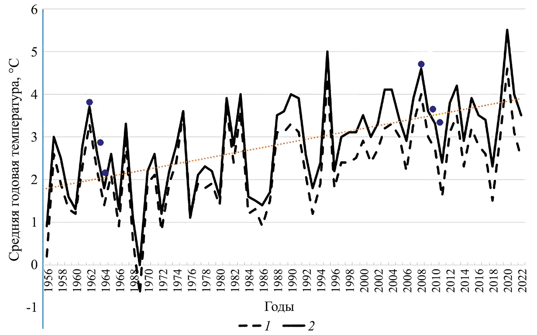 Рис. 3. Многолетние изменения среднегодовой температуры воздуха по данным метеостанций городов Миасс (1) и Челябинск (2) и годы находок Caulinia flexilis (синие точки).