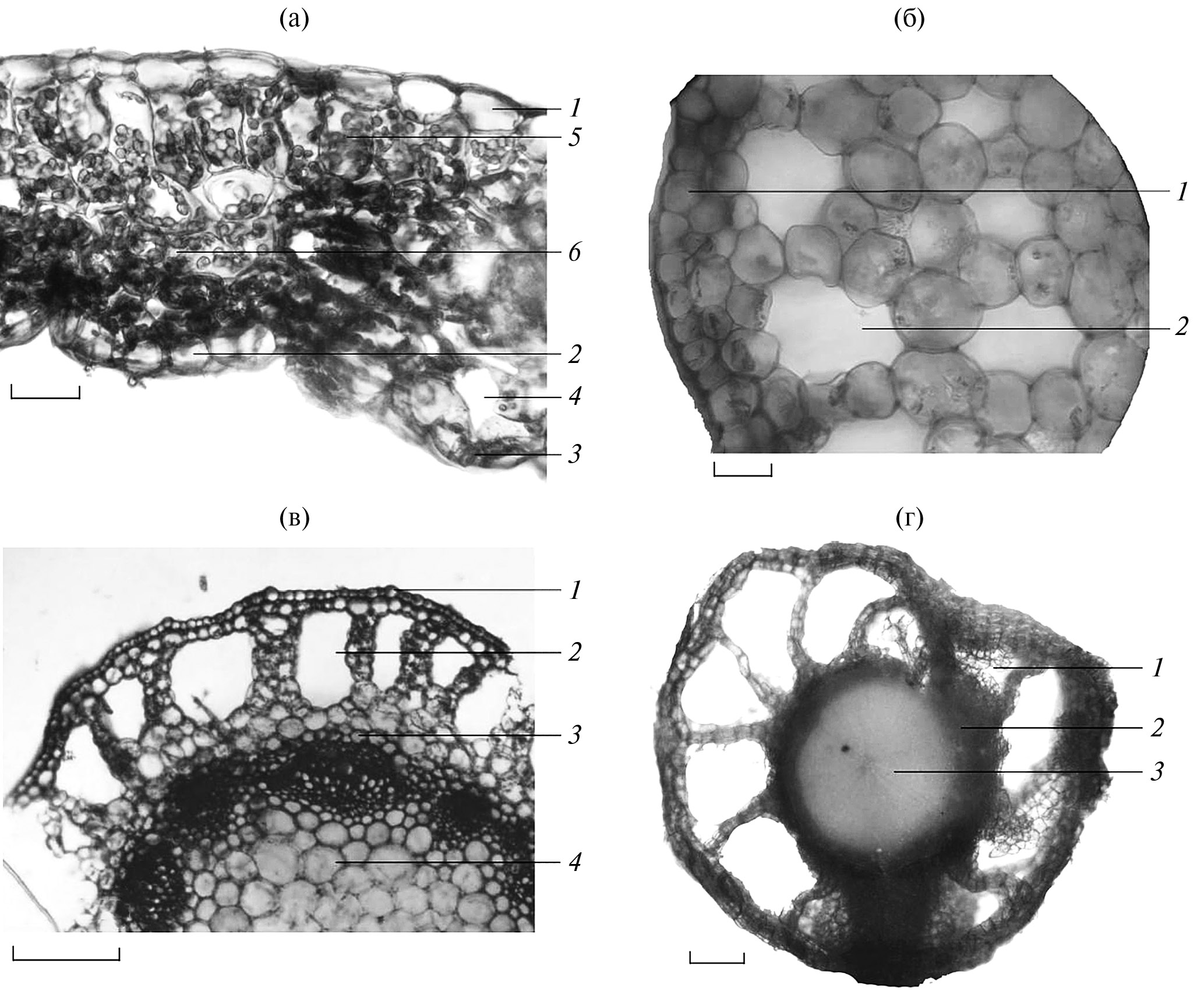 Рис. 3. Микрофотографии видов Lindernia procumbens (а), Gratiola japonica (б), Limosella aquatica (в), Lindernia procumbens (г): а — лист (1 – столбчатый мезофилл, 2 – губчатый мезофилл; б — стебель (1 – сосуды ксилемы, 2 – эндодерма, 3 – аэренхима, 4 – основная паренхима); в — корень (1 – эндодерма, 2 – аэренхима, 3 – стела); г — корень (1 – сосуды ксилемы, 2 – эндодерма, 3 – аэренхима). Масштабная линейка: а, г — 12 мкм; б, в — 4.7 мкм.