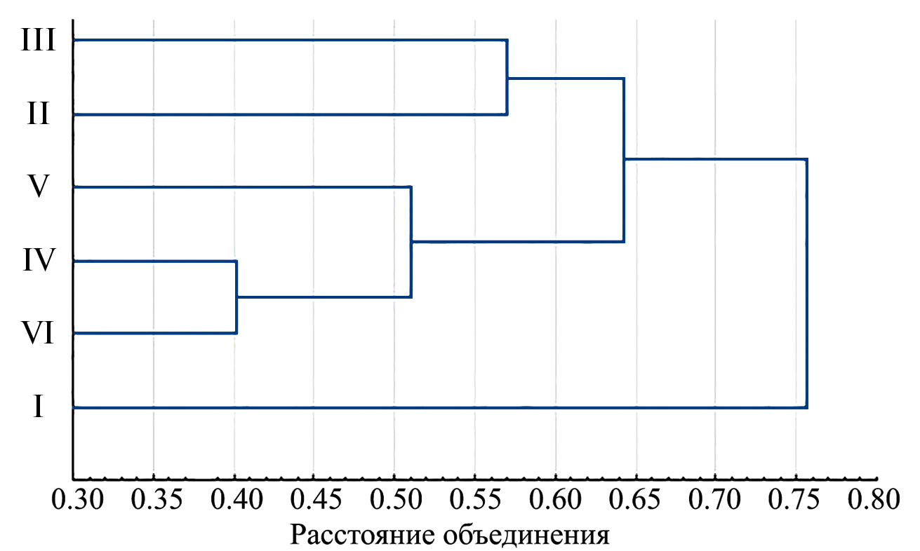 Рис. 3. Дендрограмма иерархической кластеризации видового состава зоопланктона разных бобровых прудов по индексу Серенсена.