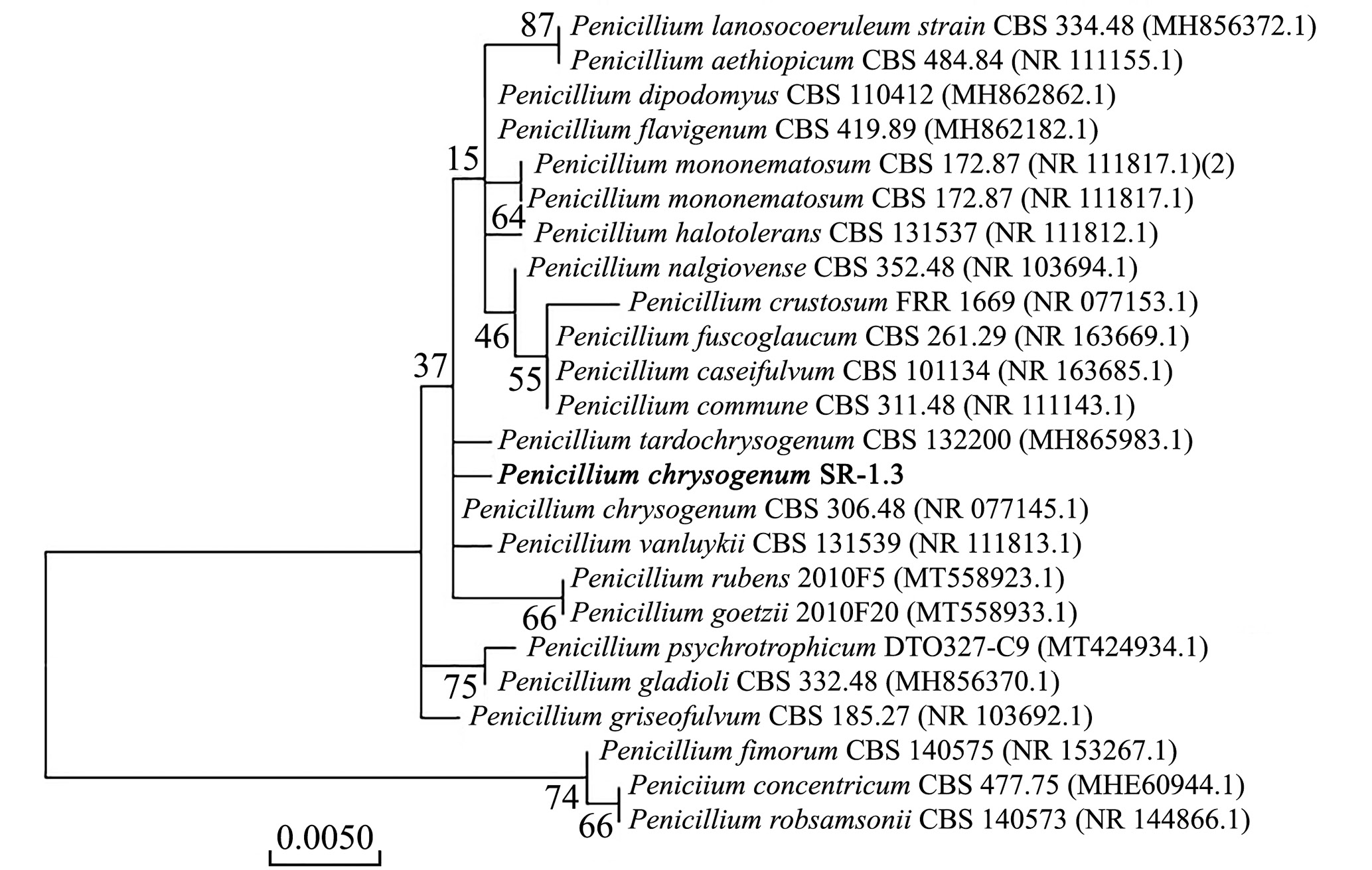 С помощью метода секвенирования показано, что последовательность ITS штамма SR–1.3 имеет максимальное сходство (100%) с ближайшими типовыми штаммами микромицетов рода Penicillium — P. tardochrysogenum strain CBS 132200 и P. chrysogenum strain CBS 306.48. (рис. 1). По совокупности морфолого-культуральных свойств и результатов секвенирования рДНК изолят SR–1.3 идентифицирован как Penicillium chrysogenum.