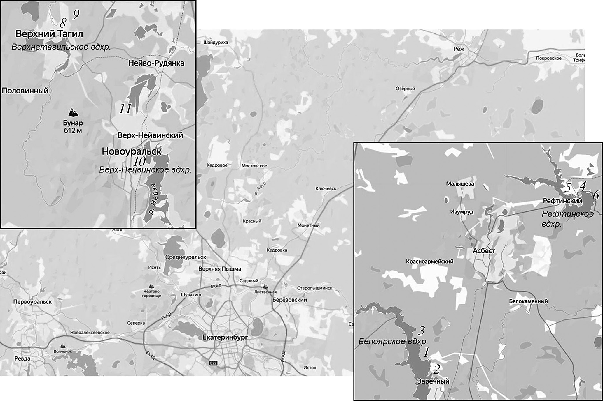 Рис. 1. Карта района исследований. 1 – Белоярское водохранилище, промливневый канал (ПЛК) БАЭС; 2 – зона сброса подогретой воды из систем охлаждения атомной электростанции в Белоярское водохранилище; 3 – водоем в лесу за четвертым энергоблоком БАЭС; 4 – Рефтинское водохранилище, прибрежная часть водоема напротив Рефтинской ГРЭС; 5 – Рефтинское водохранилище, теплый канал; 6 – Рефтинское водохранилище, канал напротив гидроузла; 7 – Верхнетагильское водохранилище в районе ГРЭС; 8 – р. Тагил за плотиной Верхнетагильского водохранилища; 9 – изолированный водоем ниже плотины недалеко от точки 8; 10 – Верх-Нейвинское водохранилище в районе железнодорожного вокзала; 11 – небольшой водоем между сбросными каналами Уральского электрохимического комбината.
