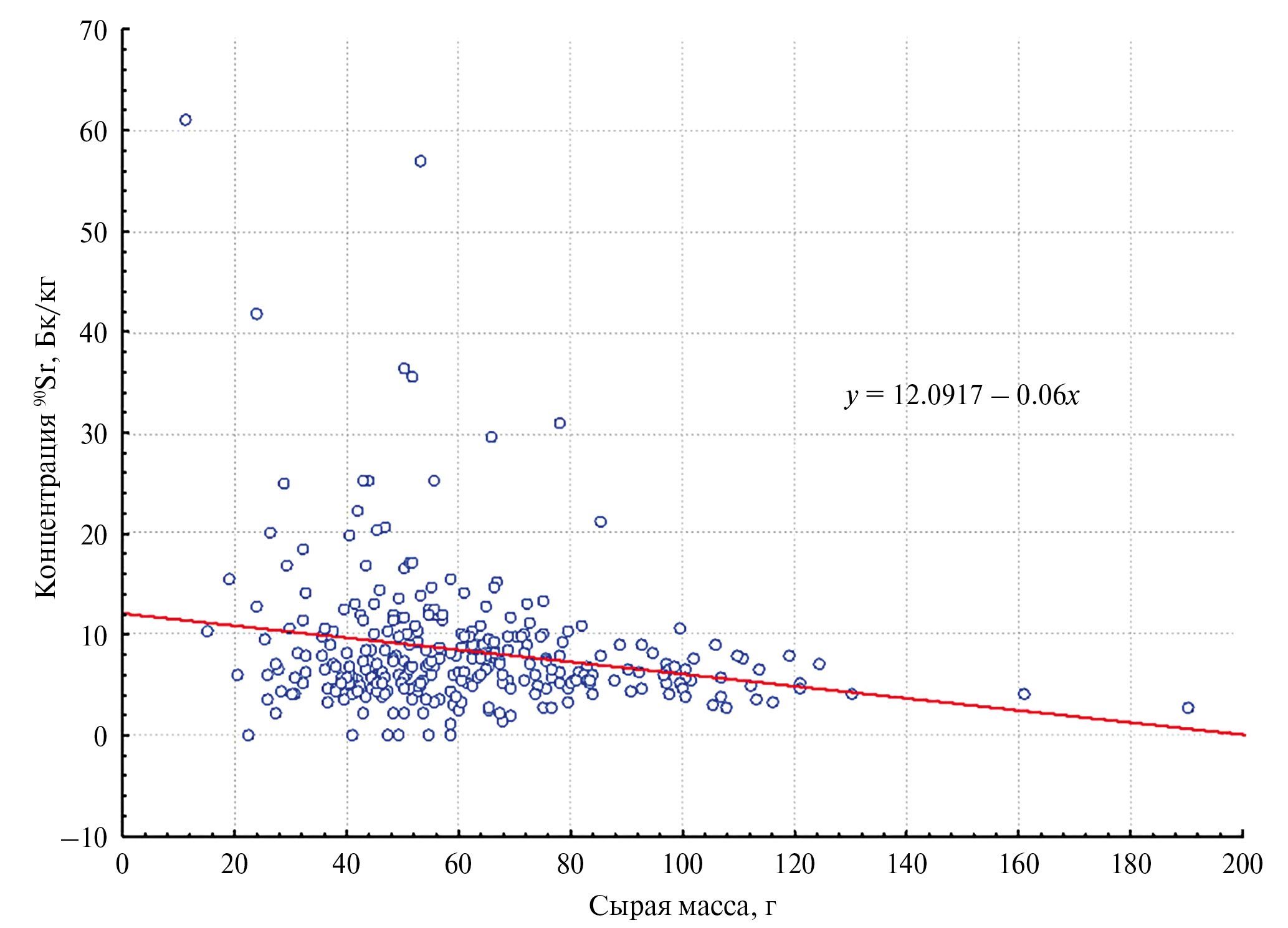 Рис. 3. Зависимость концентрации 90Sr от сырой массы лягушек.