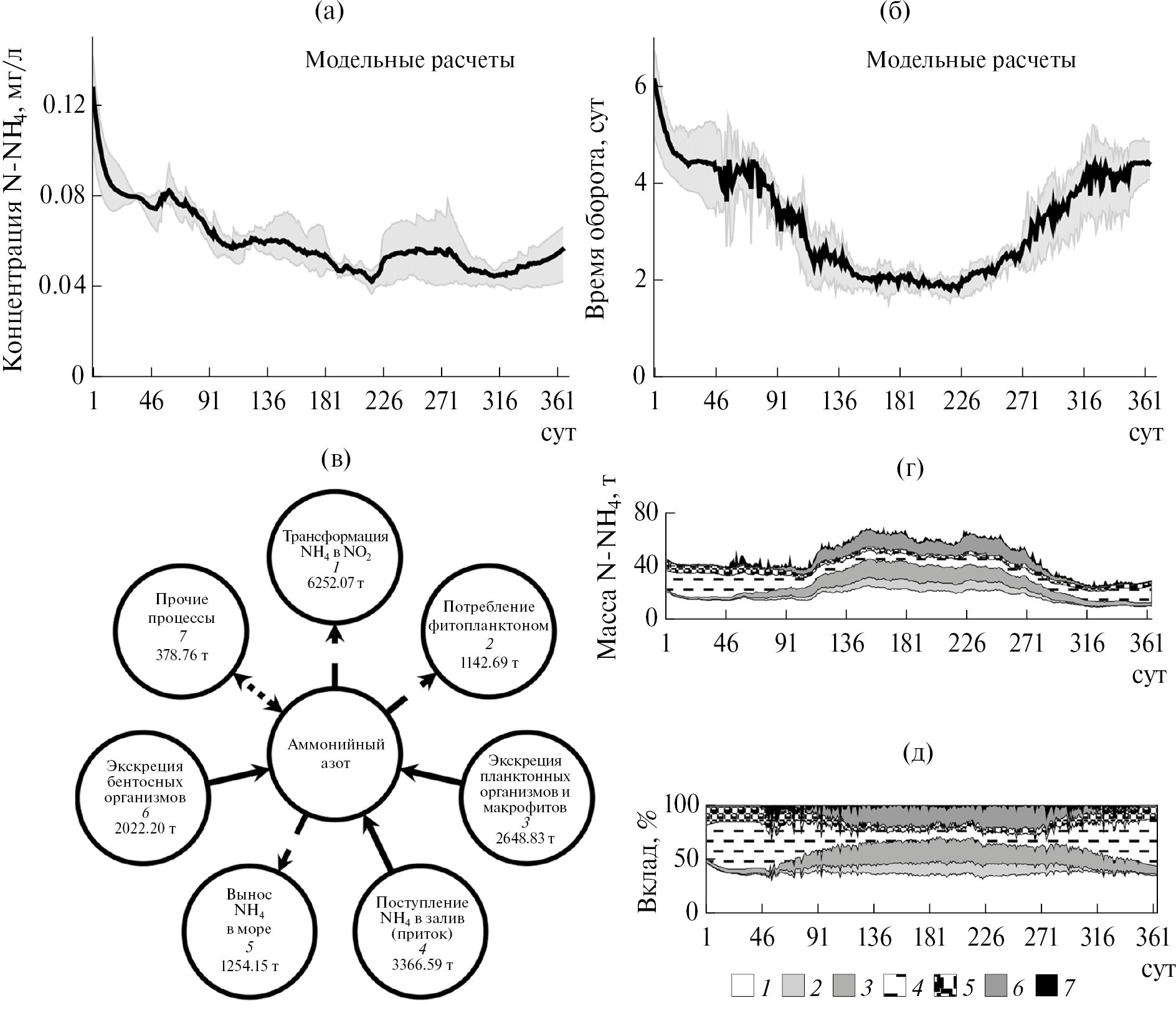 Рис. 4. Результаты моделирования внутригодовой динамики концентрации аммонийного азота (а), времени оборота (б) и составляющих баланса (в‒д) N – NH+4 в экосистеме ВЗ.